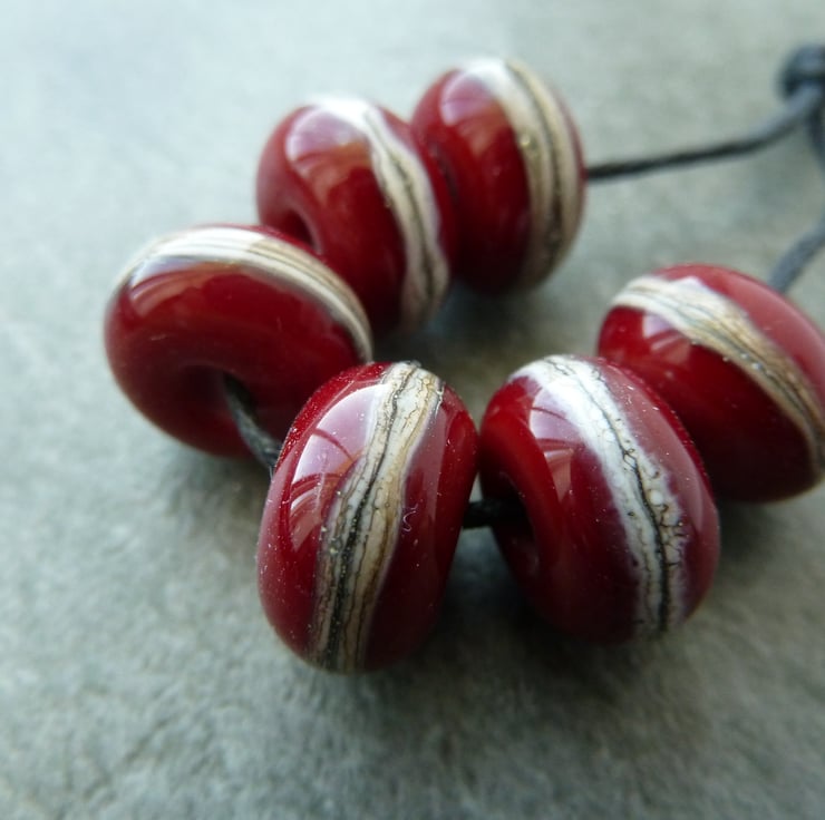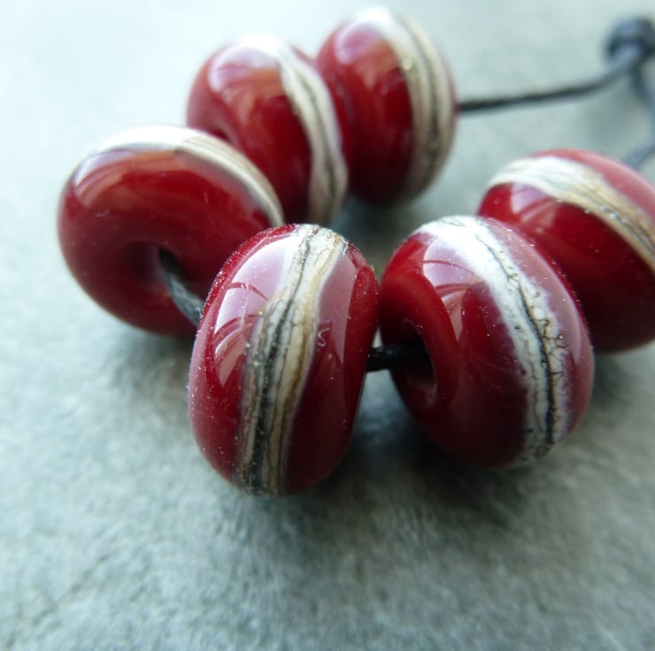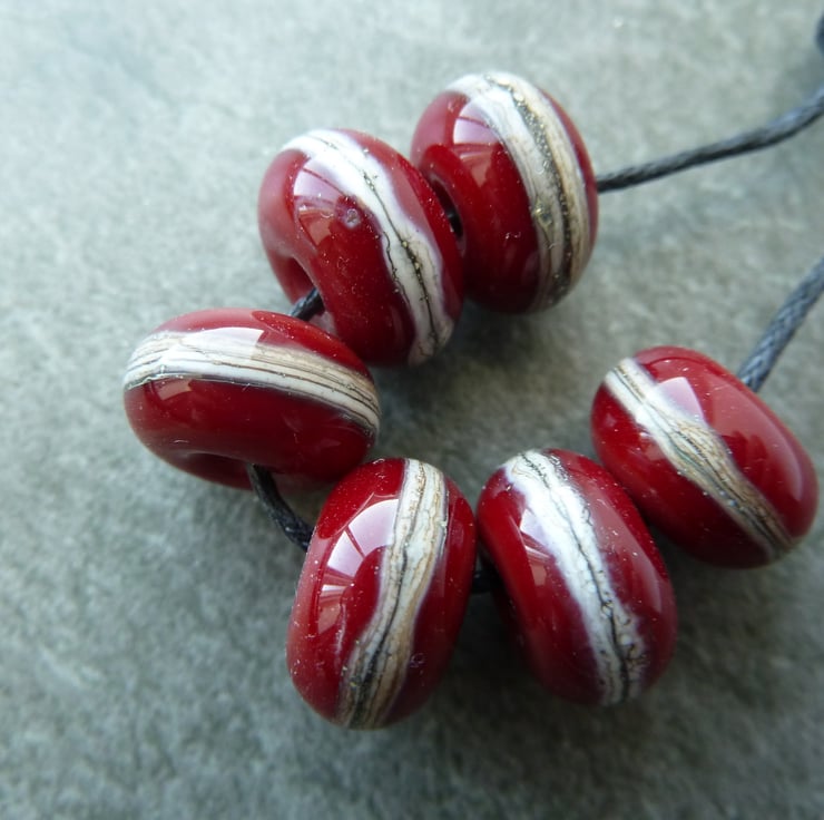 A set of 6 lampwork glass beads made with dark red glass and wrapped with silvered ivory.
