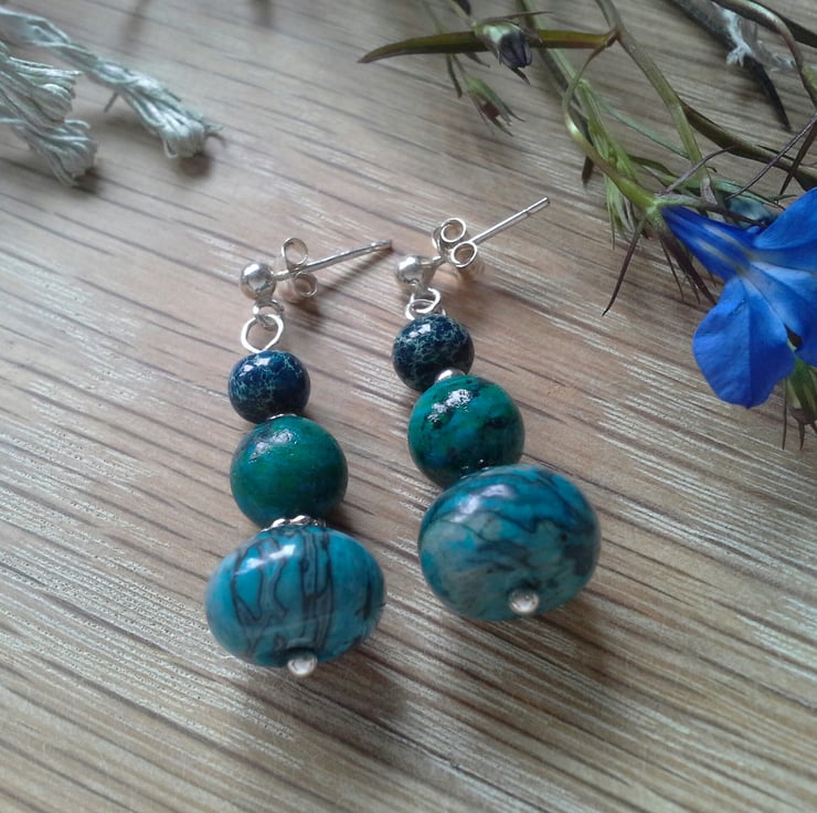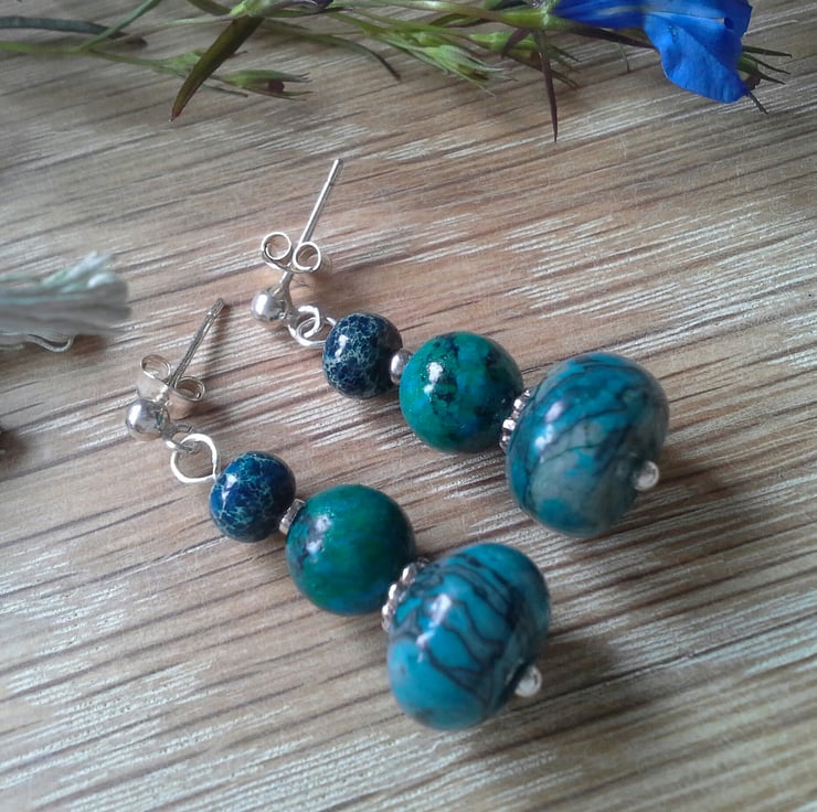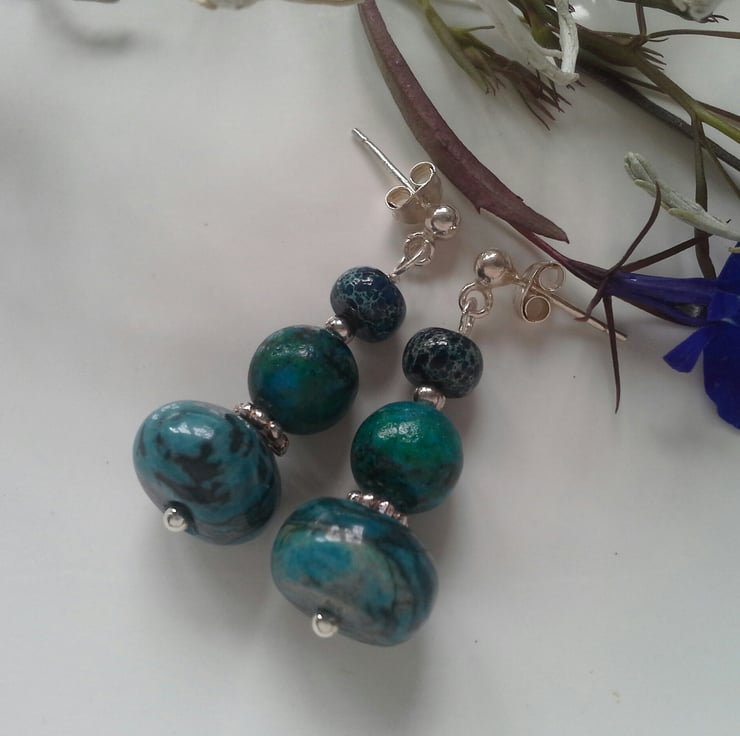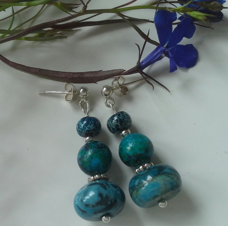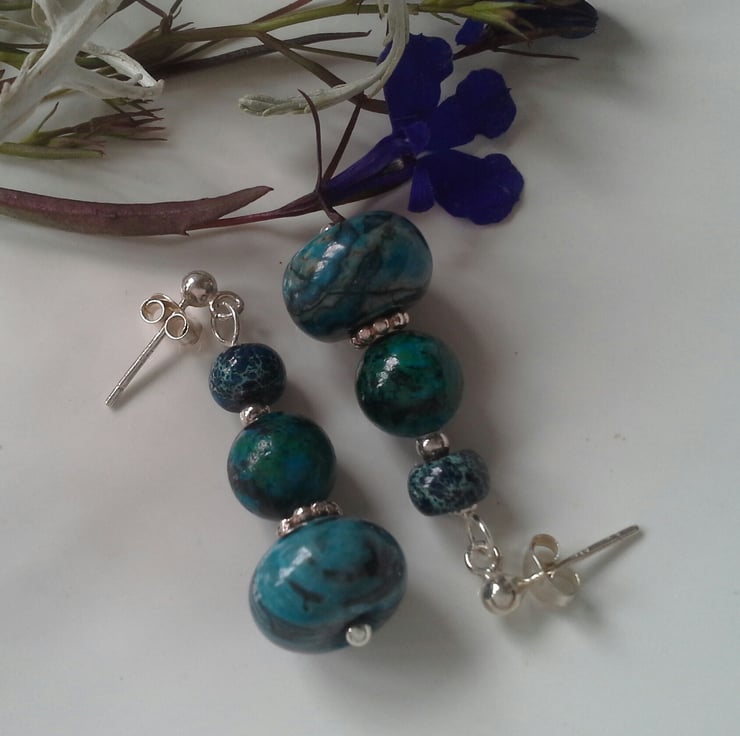 A sweet eye catching pair of earrings designed and hand crafted using graduated in size genuine jasper rondelle and round cut gemstone beads. All components are quality silver plated.