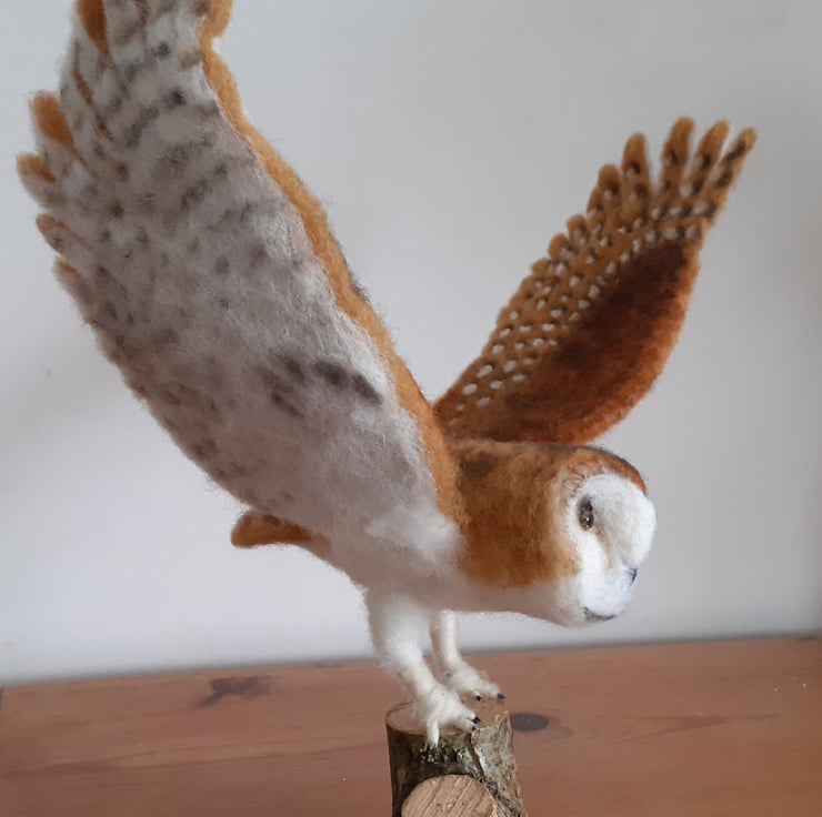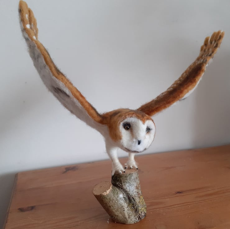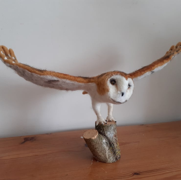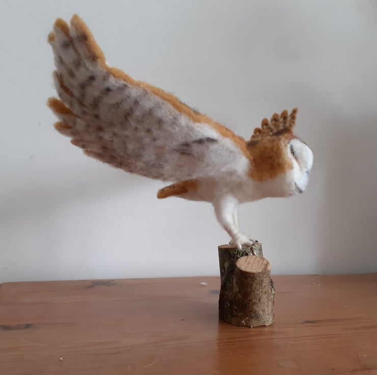 All wool,needle felted on a wire armature which is secured to a varnished birch wood log..