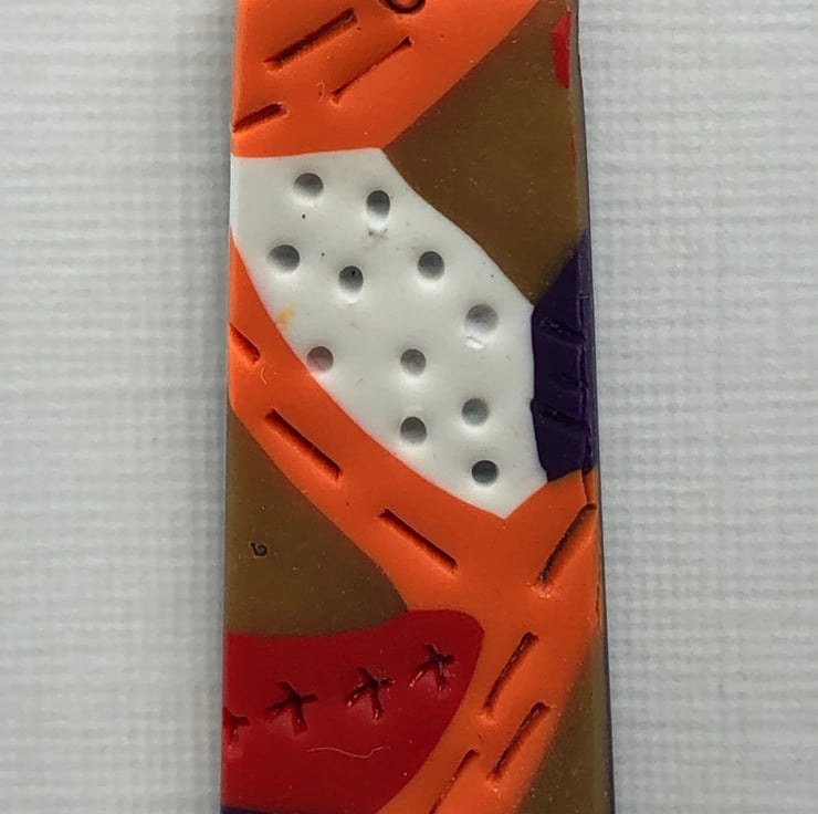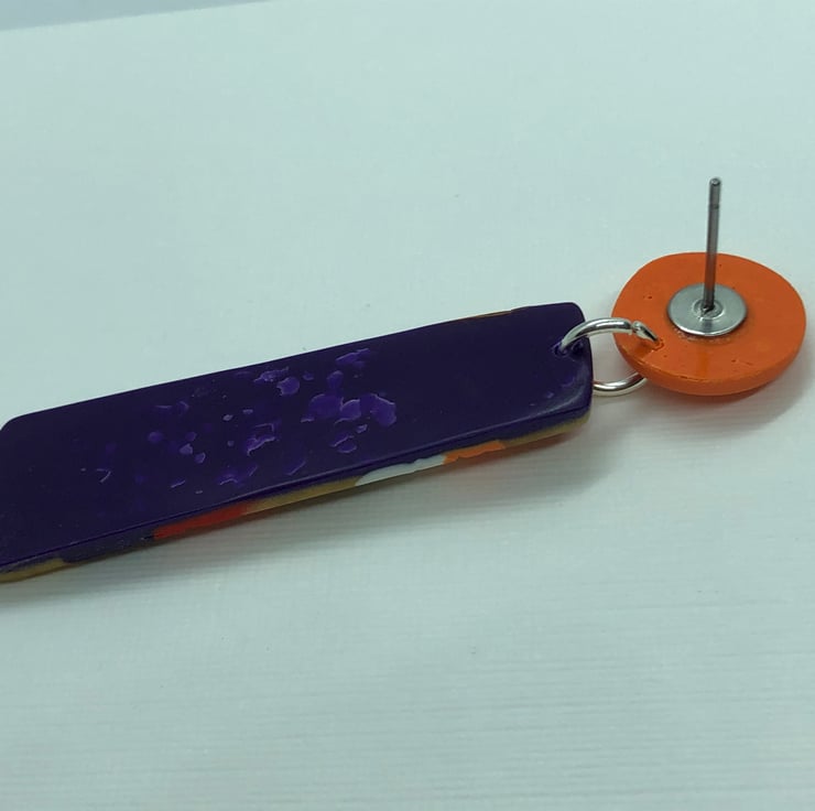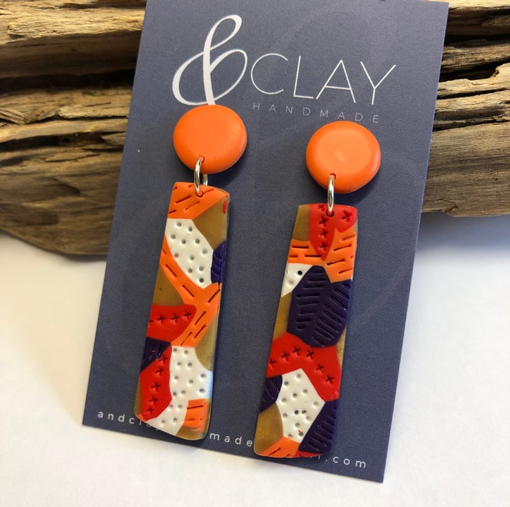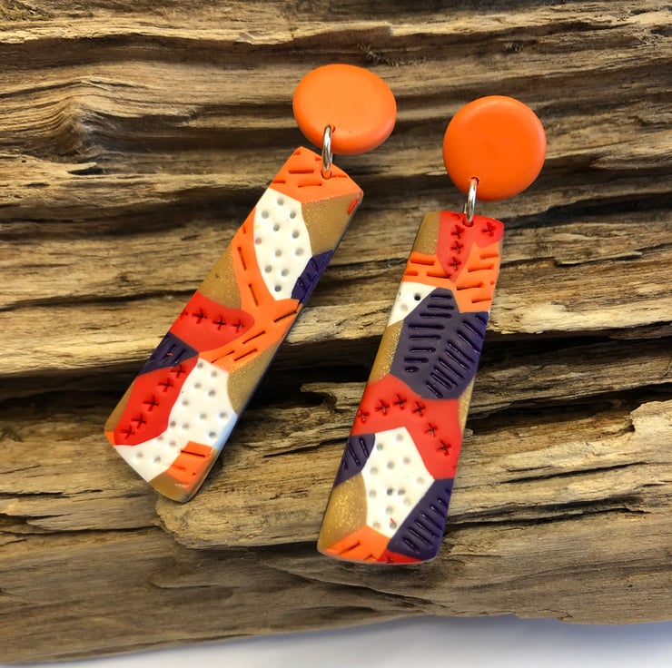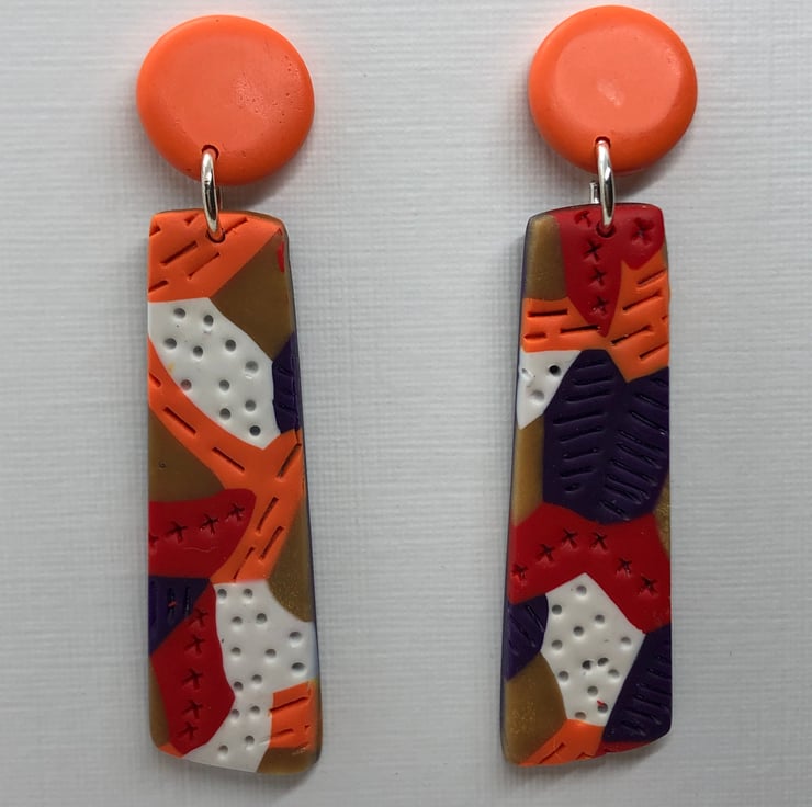 Bold and colourful textured earrings with orange stud. Made from orange, gold, red, white and purple Premo Sculpey polymer clay. They are very light weight.