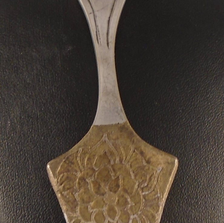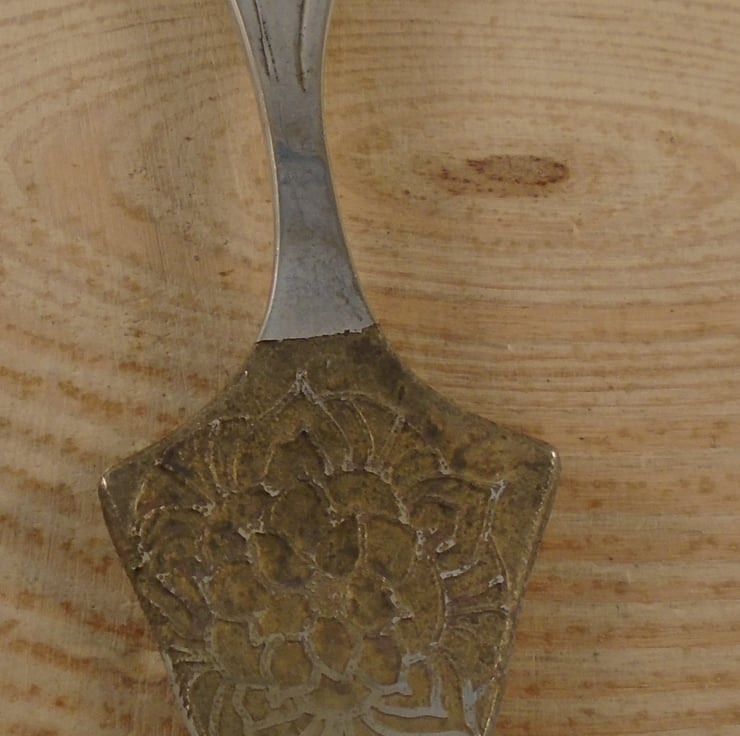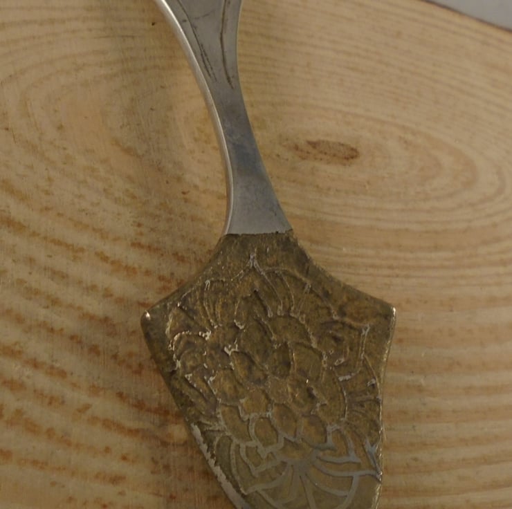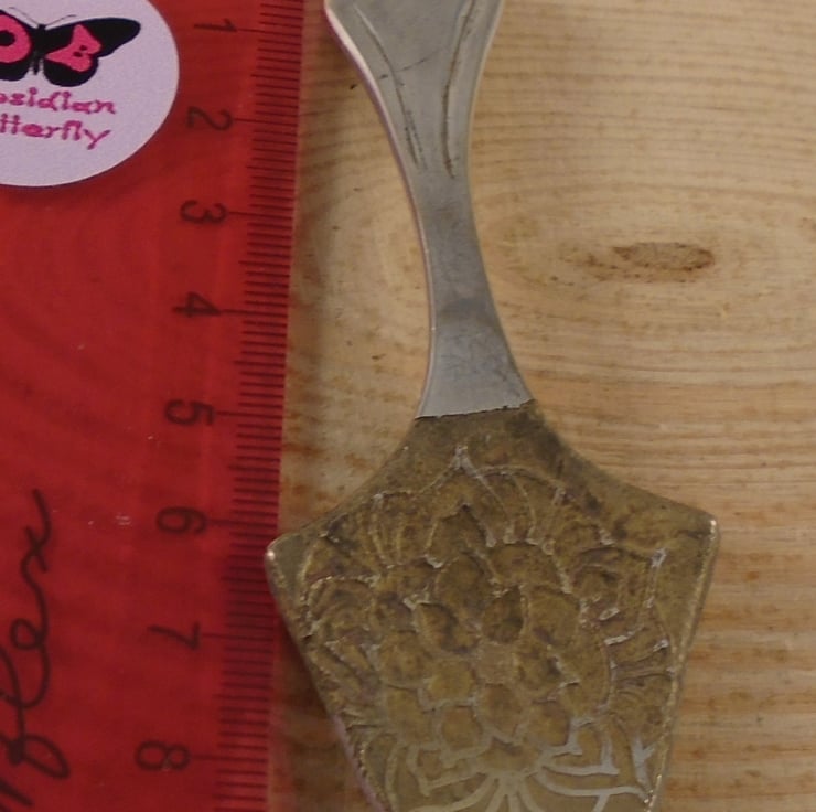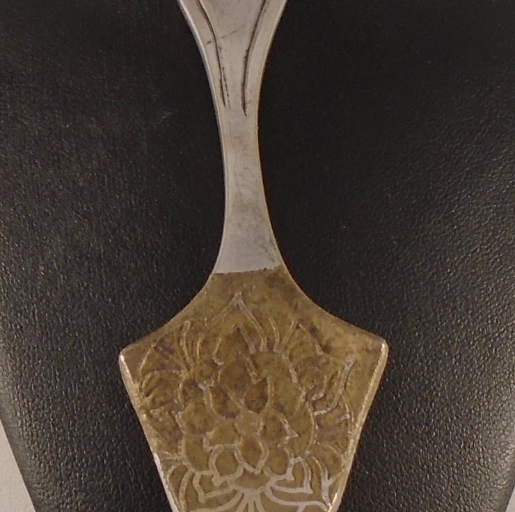 A fun and quirky spoon necklace, hand made from an old silver plated caviar spoon. The end of the spoon has been hand srawn with a mandala pattern, and etched. A hole has then been drilled in the top for a loop for the chain.