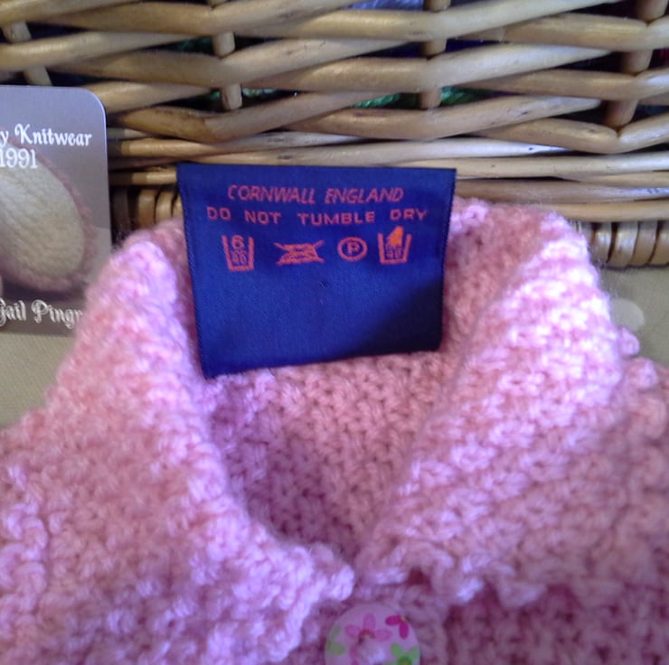 Baby knitwear is designed and hand crafted by Demelza Designs in Cornwall meeting UK baby safety standards, Only branded premuim acylic, acrylic/natural fibre blends or pure natural fibre yarns are used in baby knitwear which conforms to BS984/76 standards.