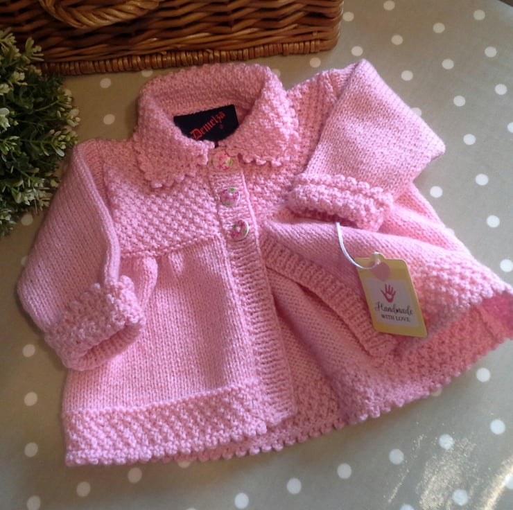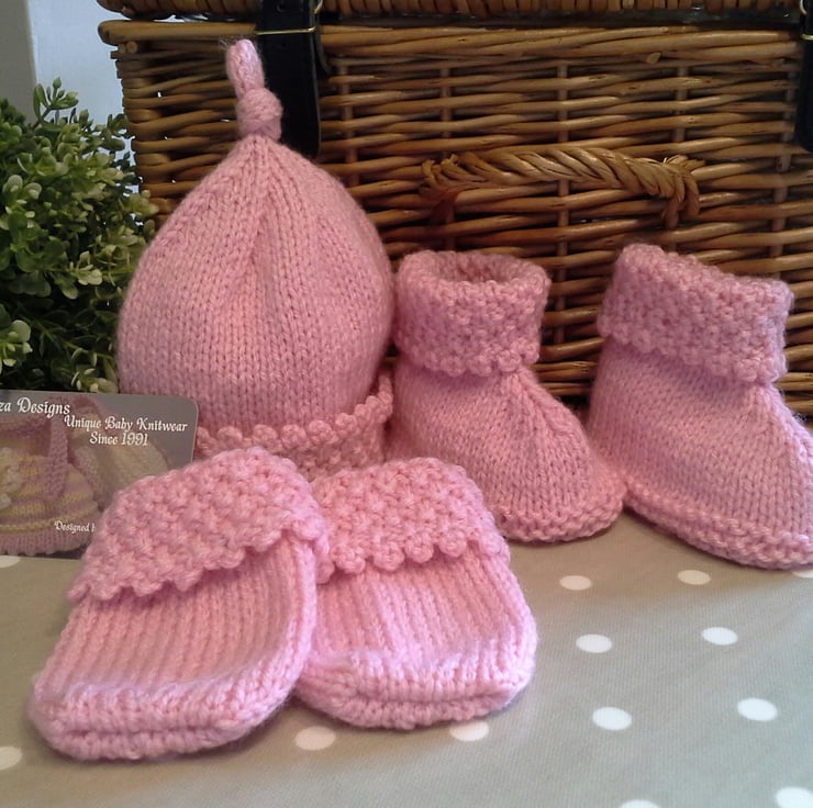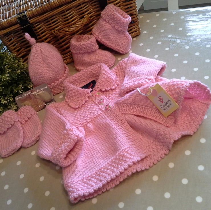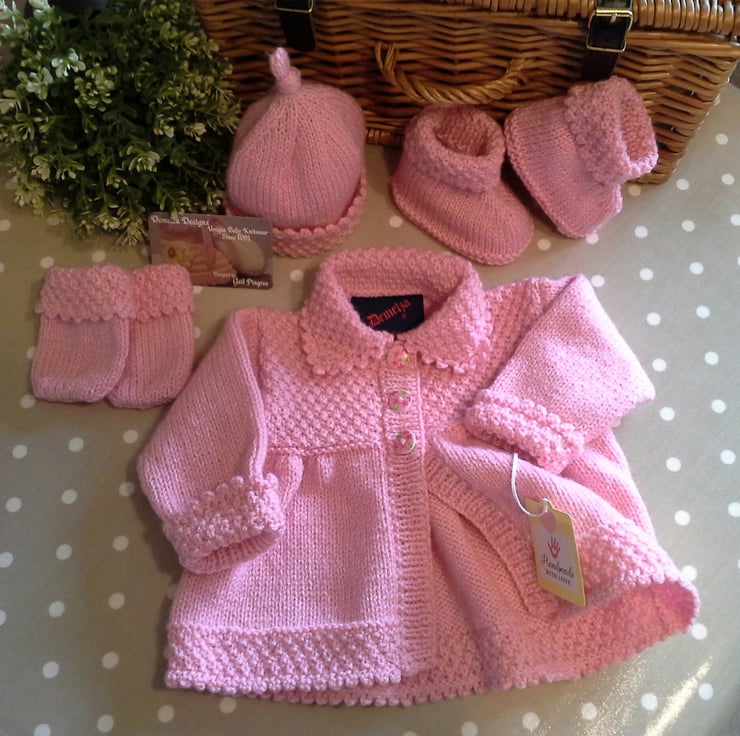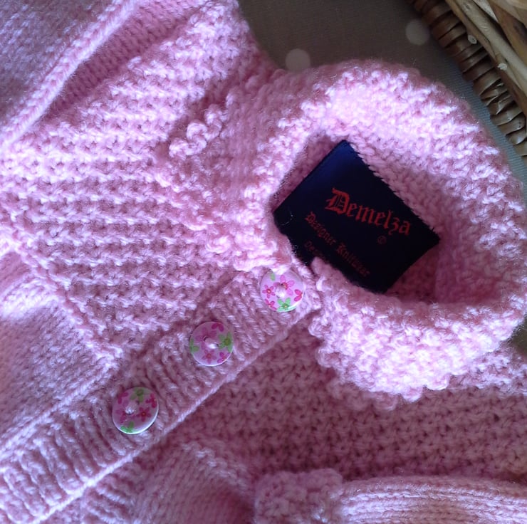 A beautiful baby girl's layette set designed on a traditional theme, but modern and contemporary. The set has hand crotcheted picot trim edges to the jacket, hat, booties and mittens. It has been hand knitted using quality premium machine washable British manufactured yarns. The buttons are made from genuine wood with a sweet flower design on them. The jacket has the luxury designer garment label attached to the back neck edge with the care instructions woven within it on the reverse side, and as proof of it's origins if gifting. The jacket also has the designer swing tags attached.