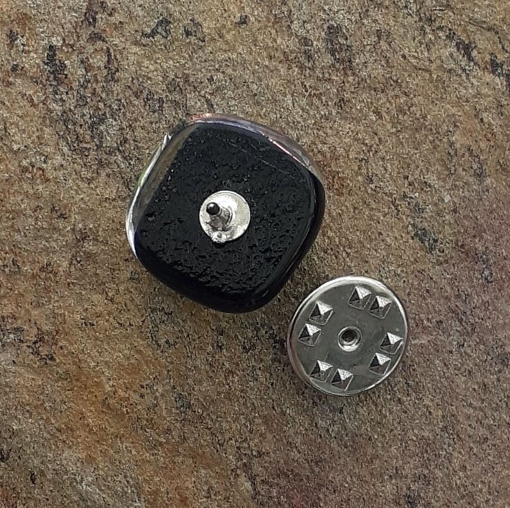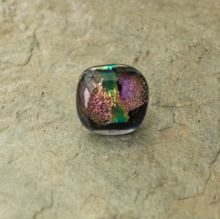 It is made from a layer of rainbow coloured dichroic glass which has been capped with clear glass. A session in the kiln being heated to around 800C forms a single piece of glass, which is glued on to a stud backing once it's cooled.