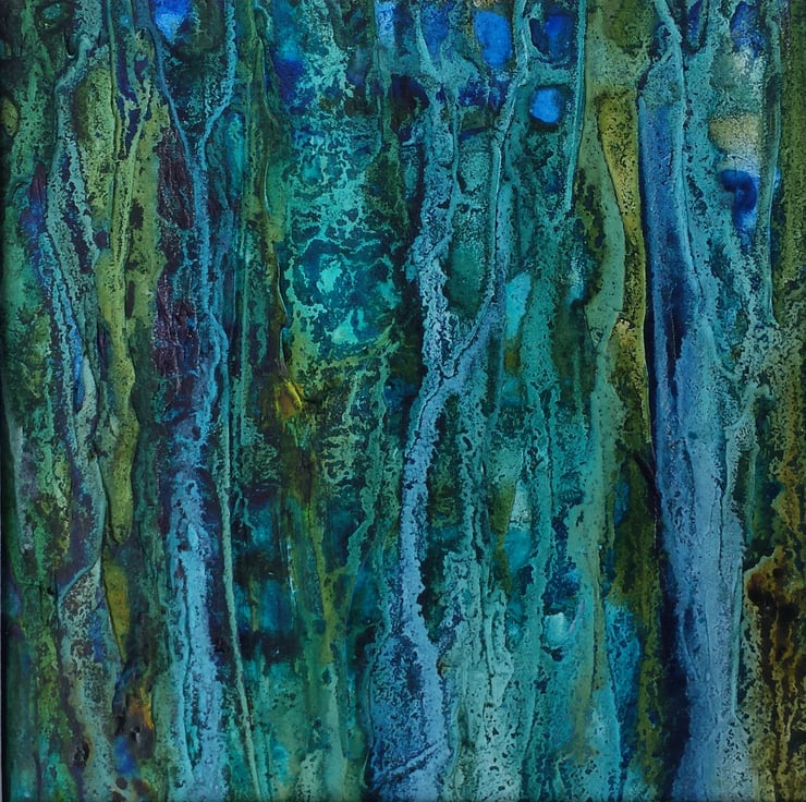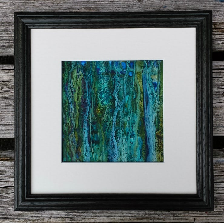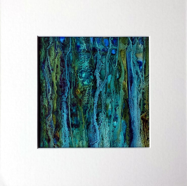 Forest Flow is an original abstract painting created using acrylic inks and texture paste on a gessoed mountboard substrate.