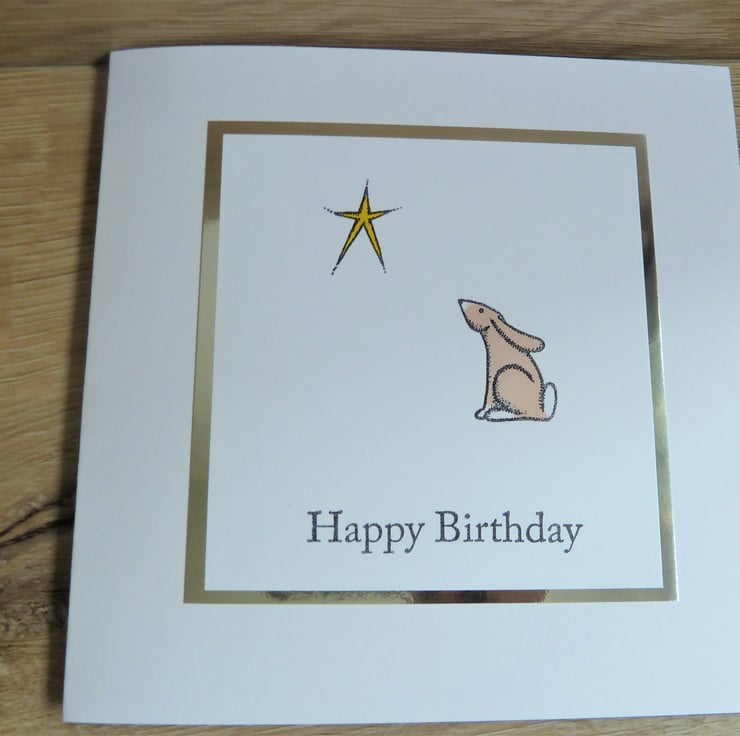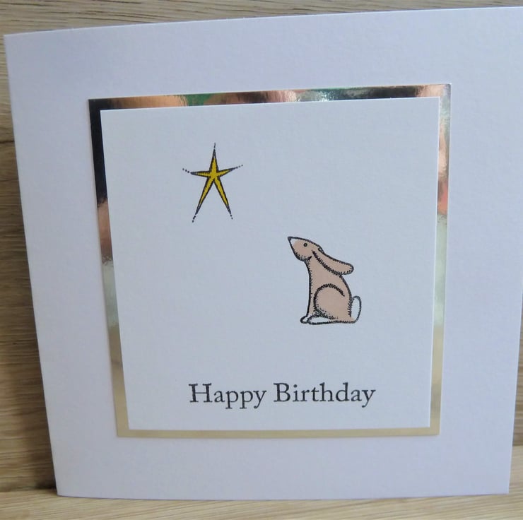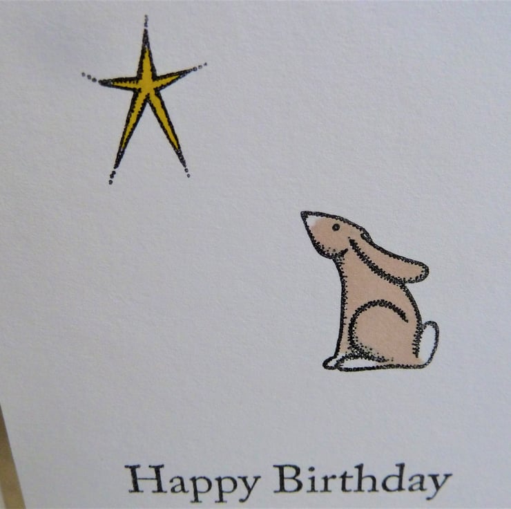 A card which features a hand stamped image of a star gazing hare which has been hand coloured, the words 'Happy Birthday' have been hand stamped below.