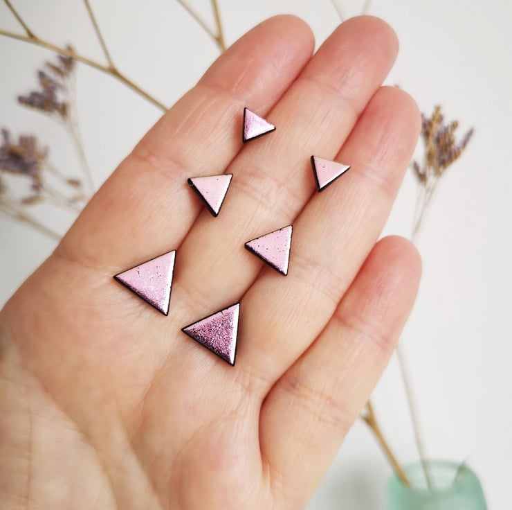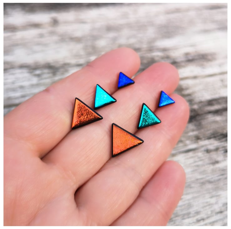 This listing is for one pair of MEDIUM triangle dichroic-glass stud earrings with sterling silver posts.