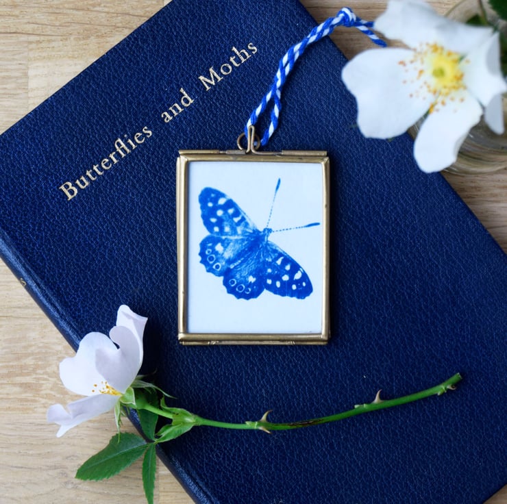 To create the butterfly Cyanotype a light sensitive solution is applied to 300gsm watercolour paper, a negative laid on then exposed to sunlight, the solution is then rinsed off and the paper dried, fixing the image in lovely blue tones.