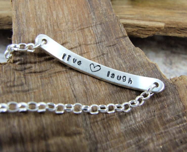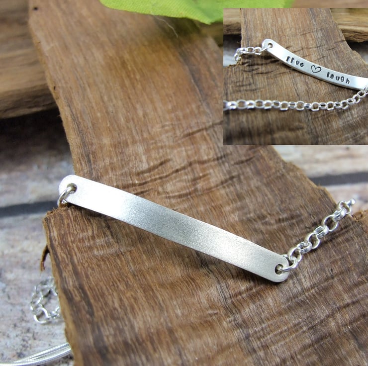 Hand forged Sterling Silver Bracelet. Bar with a matte finish and hand stamped hidden message on the reverse. Live Love Laugh. Fully adjustable slider fitting.
