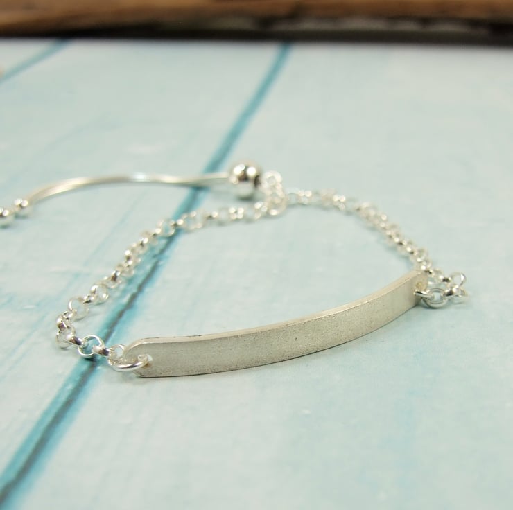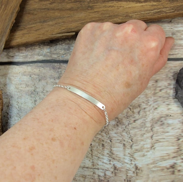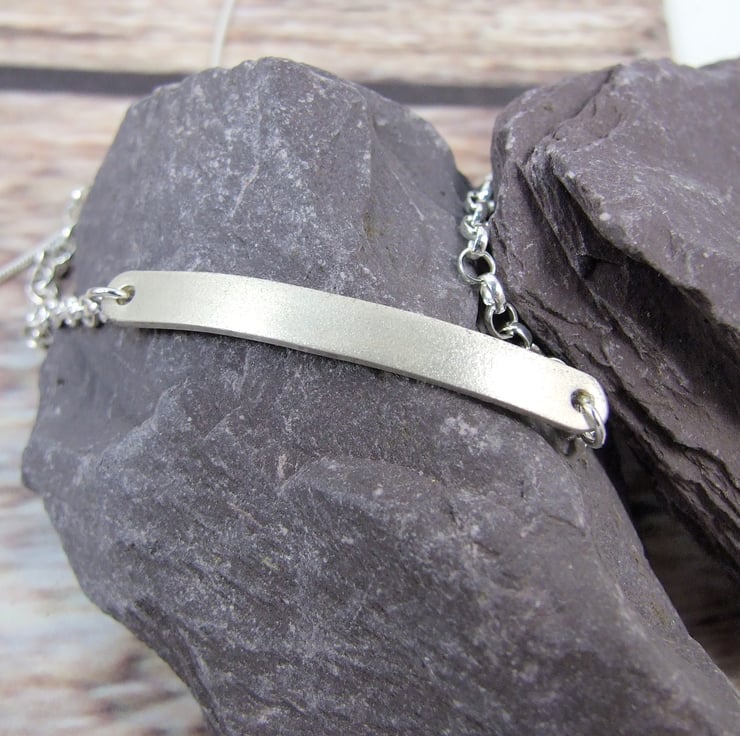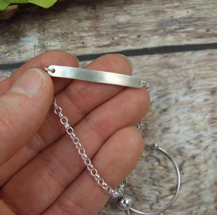The bracelet centre piece is made from 1mm thick solid sterling silver which I have hand cut, shaped, sanded drilled and then textured with a satin finishing tool and hand stamped with the message on the reverse. Fitted to sterling silver chain with adjustable fit siding closure.