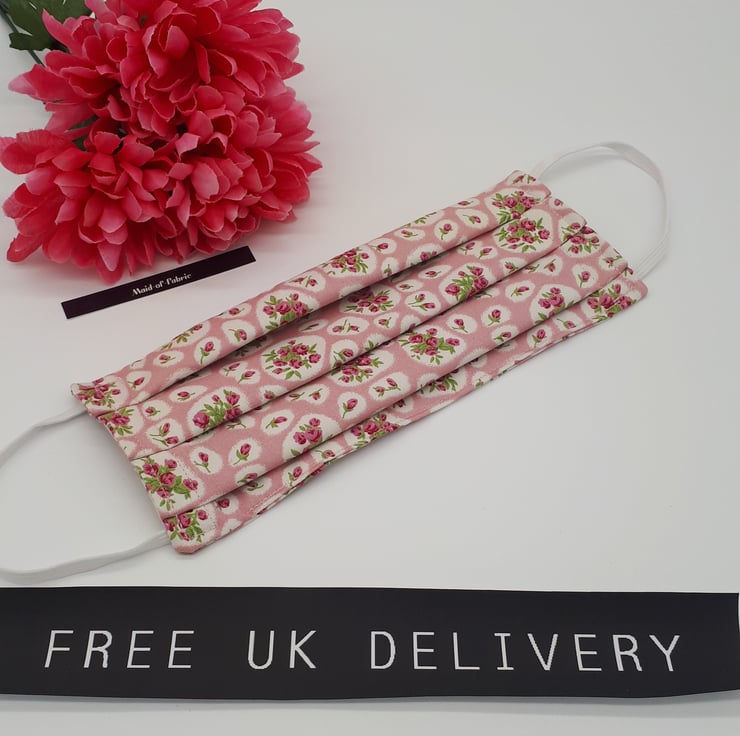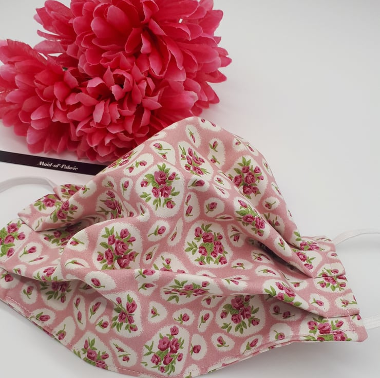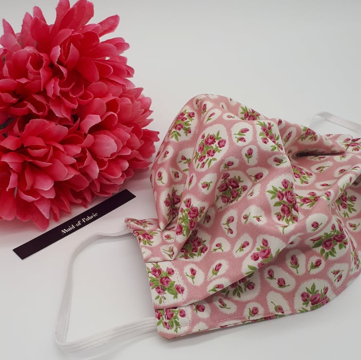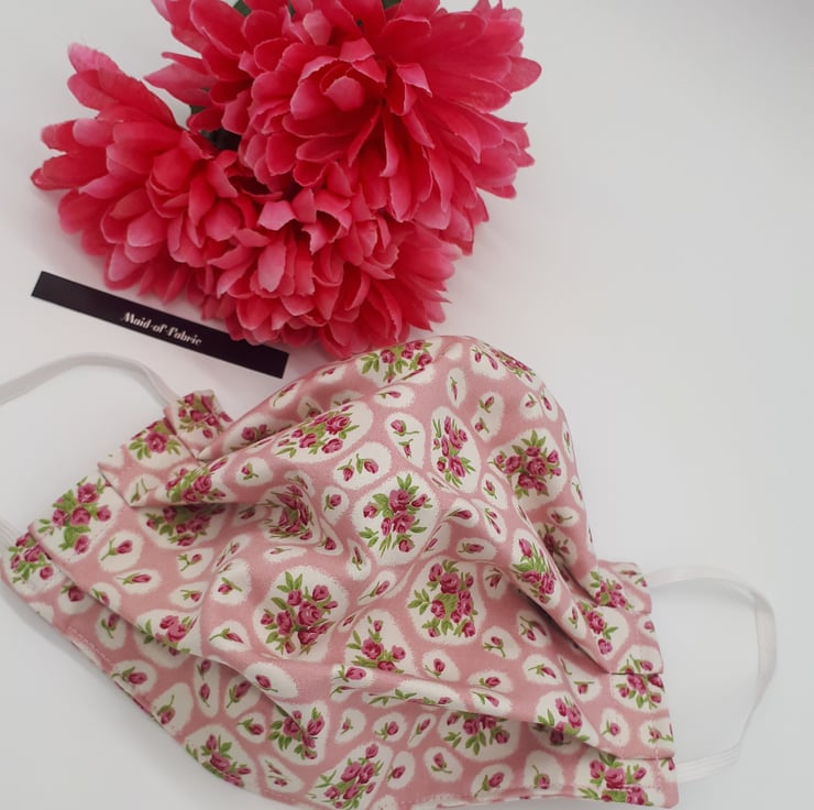 Face mask made using a soft pink and white patterned cotton fabric and white elastic.