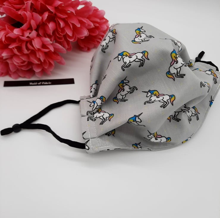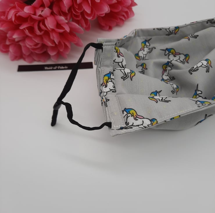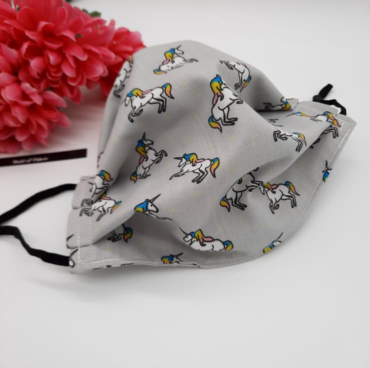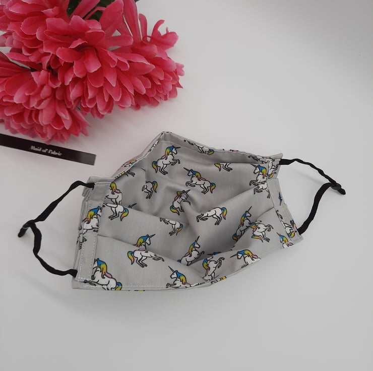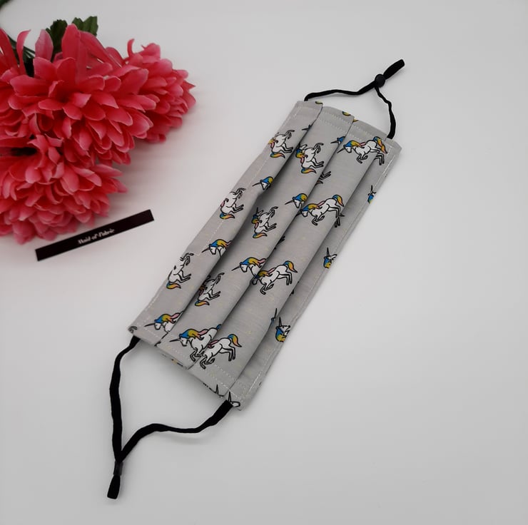 Face mask made using a light grey unicorn fabric, black adjustable elastic and a 9cm flat bendable nose wire.