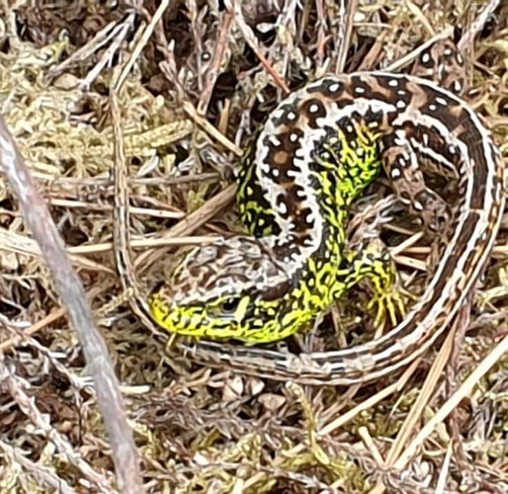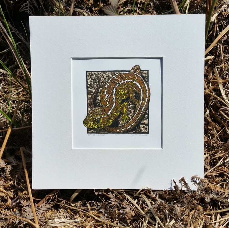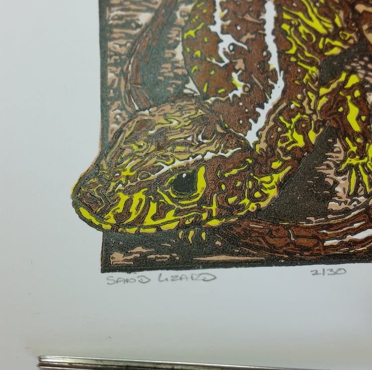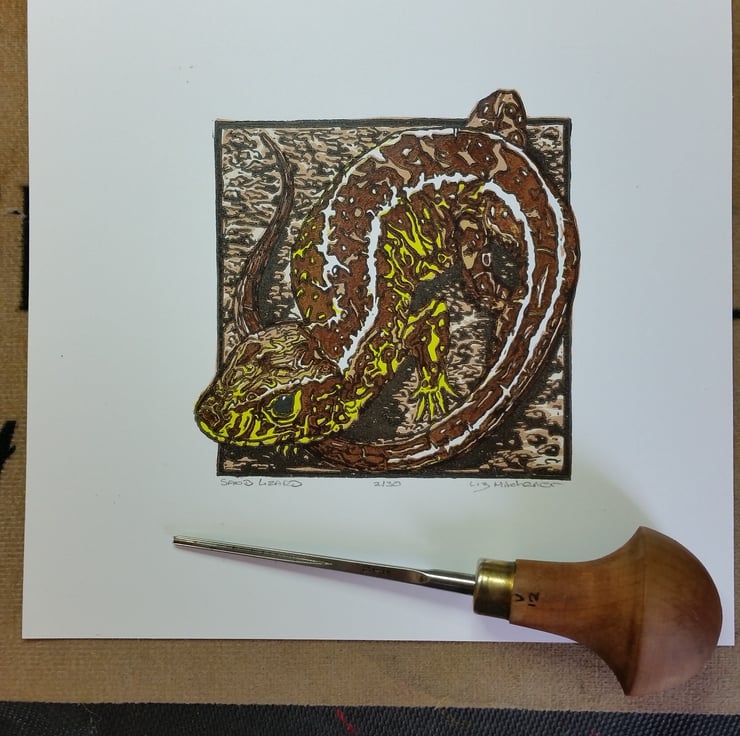 5 plate linocut colour print of a male Sand Lizard printed on Fabriano Technico paper with Calligo and Lawrence inks. A limited edition of 30.