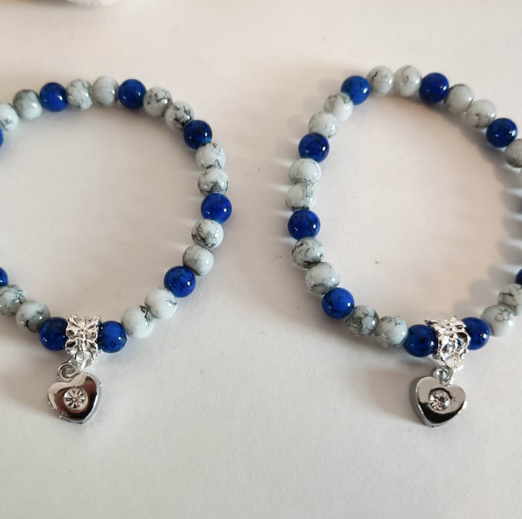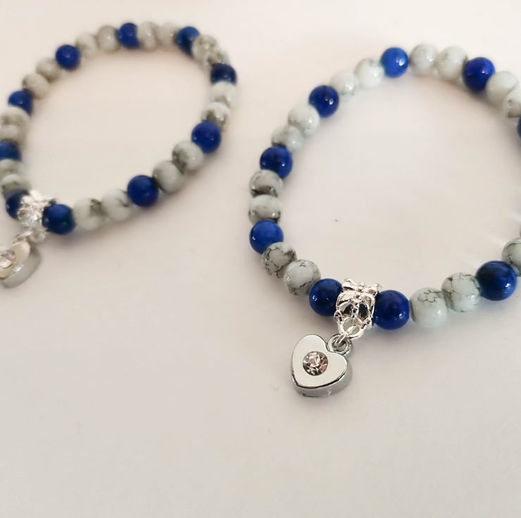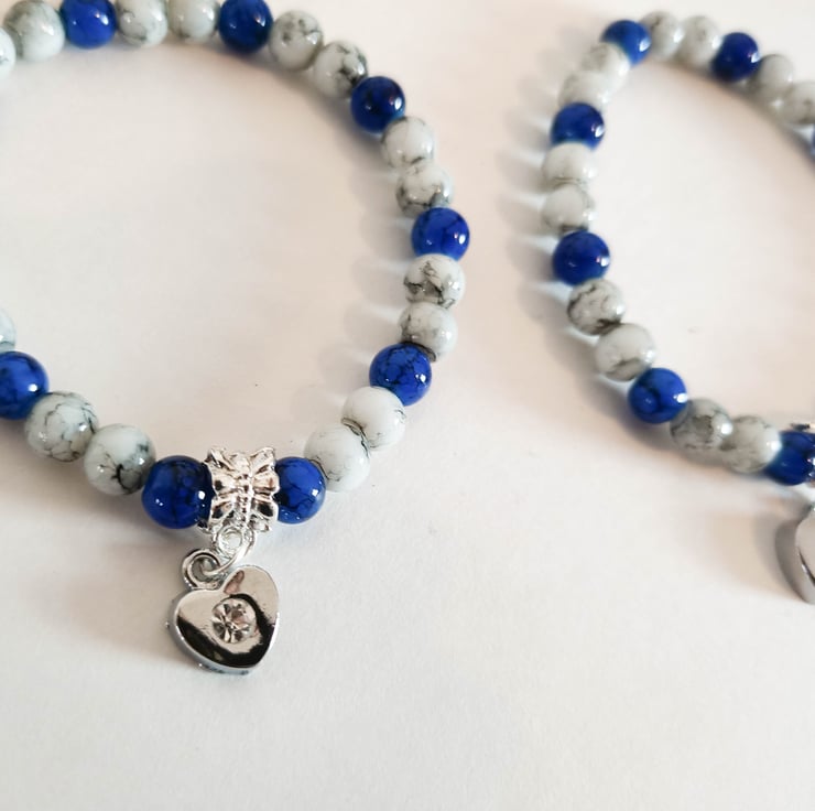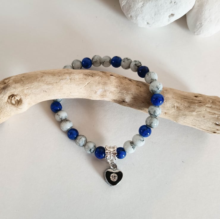 An elastic cord drawbench glass beaded stretch bracelet with a patterns of grey and blue beads, also with a heart charm.