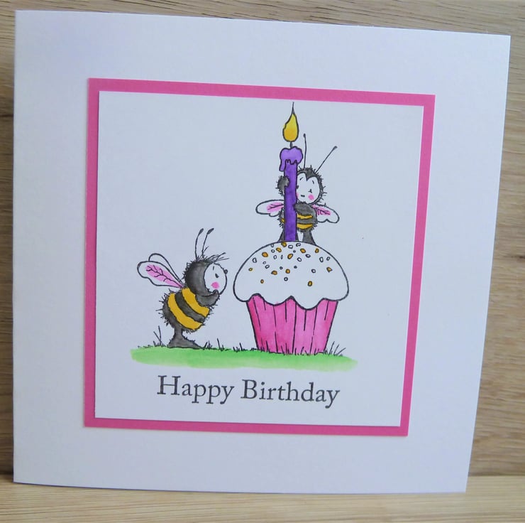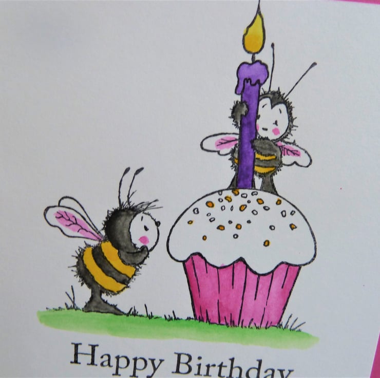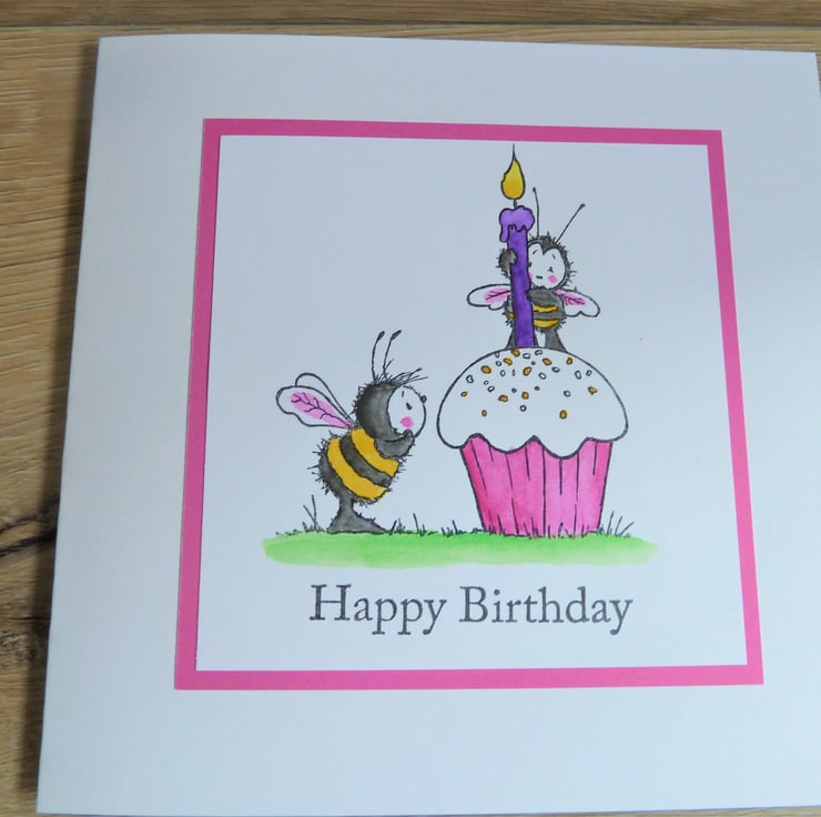 A card which features a hand stamped image of two bees with a cupcake, the image has been hand coloured using water colour pencils.