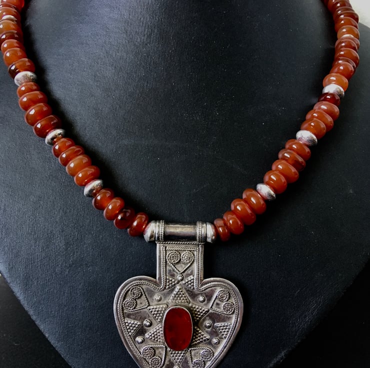 The focal point of this necklace is a lovely vintage embossed silver and carnelian pendant from Central Asia, probably Turkoman. The pattern is beautiful and the carnelian is a glowing vibrant deep orange-red. The back of the pendant is plain hammered silver, in excellent condition.