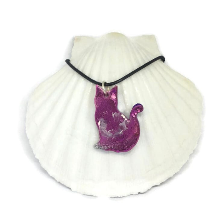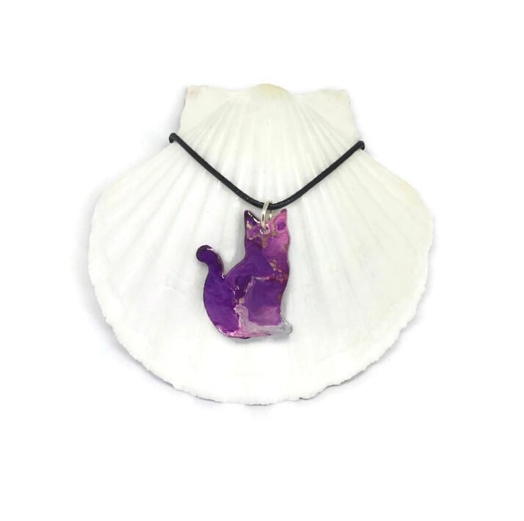 Purple cat pendant resin and ink with black cord necklace. This cat necklace can be worn either side, the sides vary due to the reaction of the alcohol inks with the resin which is known as a petri effect due to the way the colour drops through the resin.