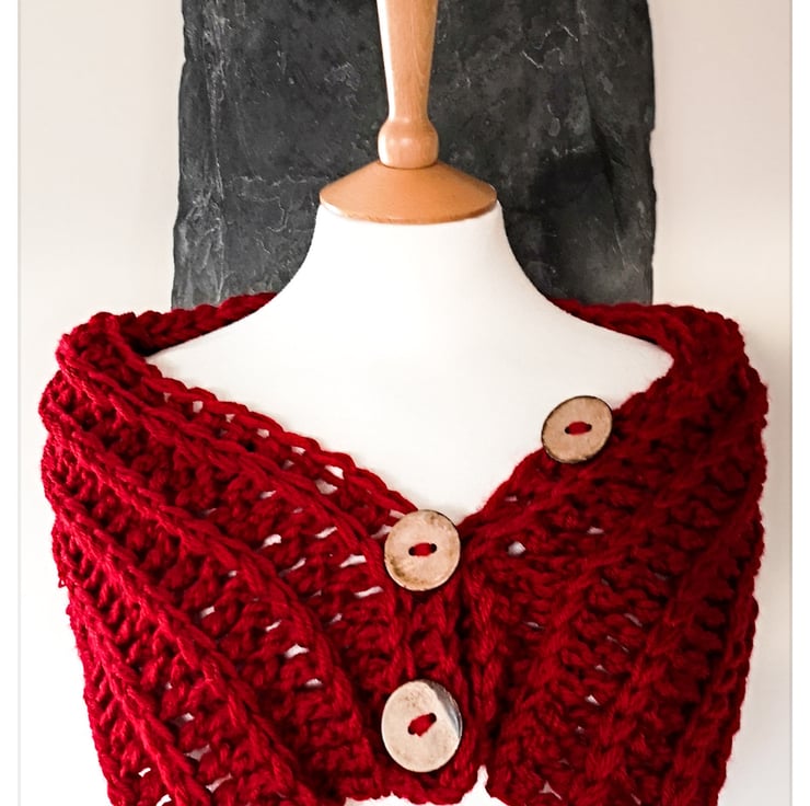 A beautiful hand crocheted button down cowl designed and created by Ginger Original.