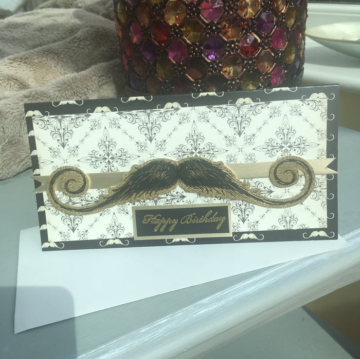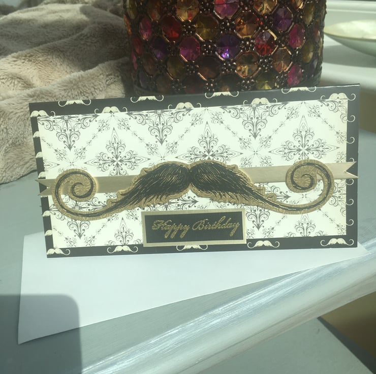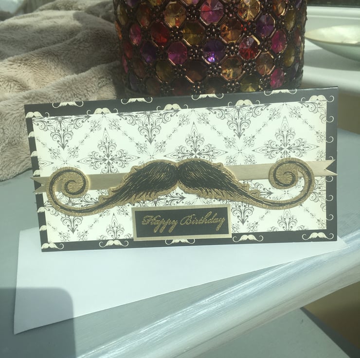 Do you love a man with a moustche? Look no further for the perfect birthday card for the handsome devil! A beautifully waxed anf twirled moustache adorns the top of this elegant birthday card. A fitting tribute to any moustachio'd man.