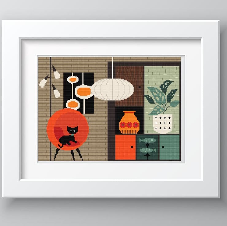 029A Cross stitch pattern - Mid Century Lounge Cat - Modern cross stitch/tapestry chart by Vivsters. No delivery costs - PDF file straight to your inbox. Start stitching straight today!
