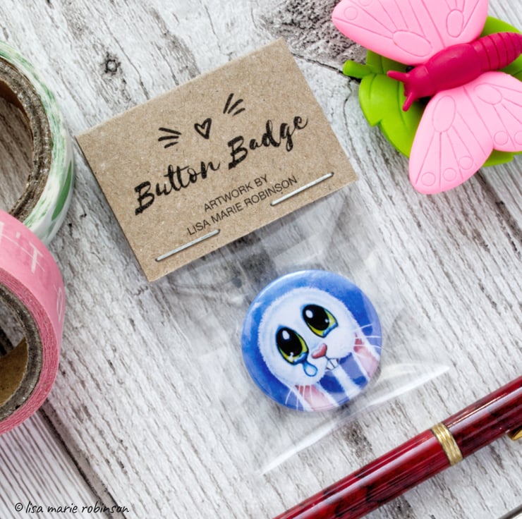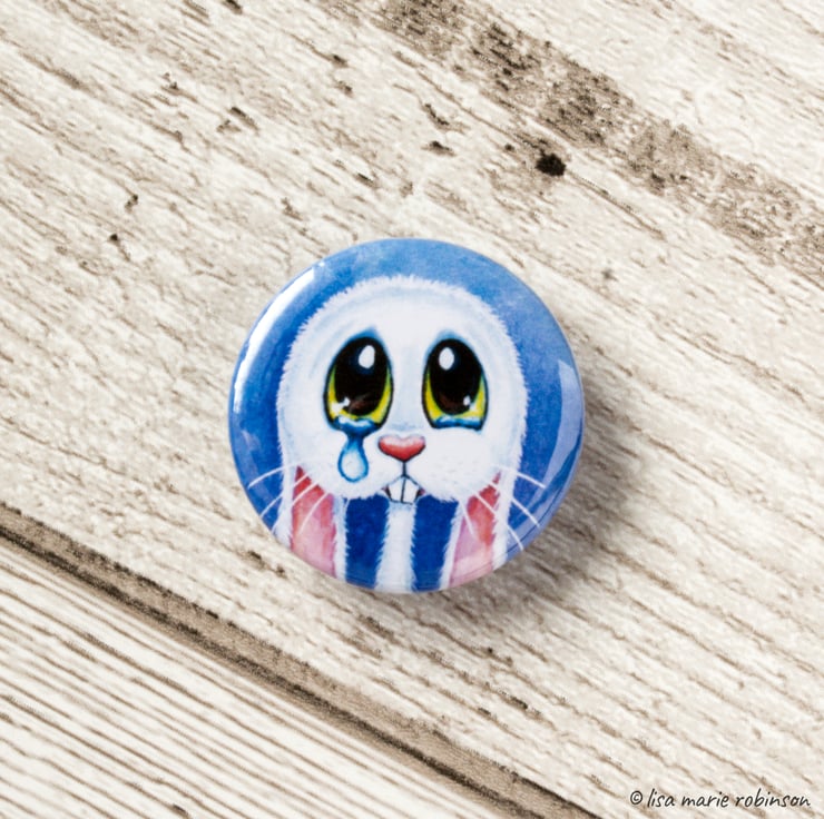 Cute little button badge featuring a painting of a white rabbit with tears in his eyes!