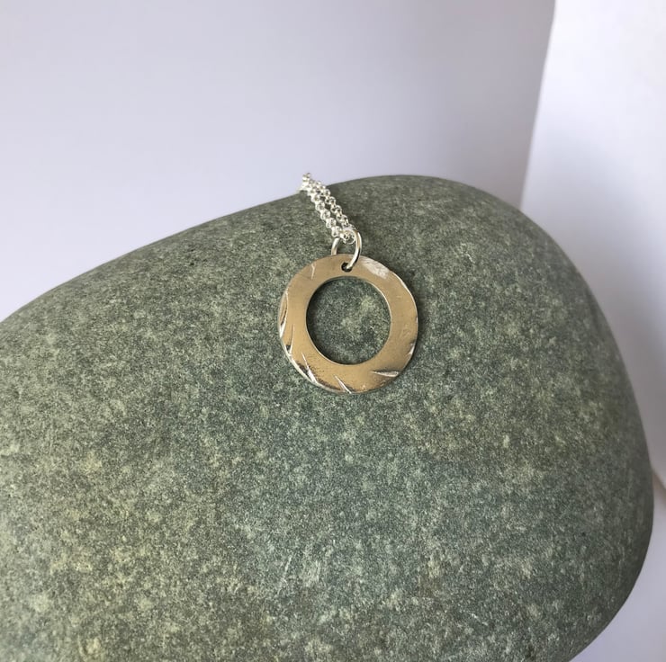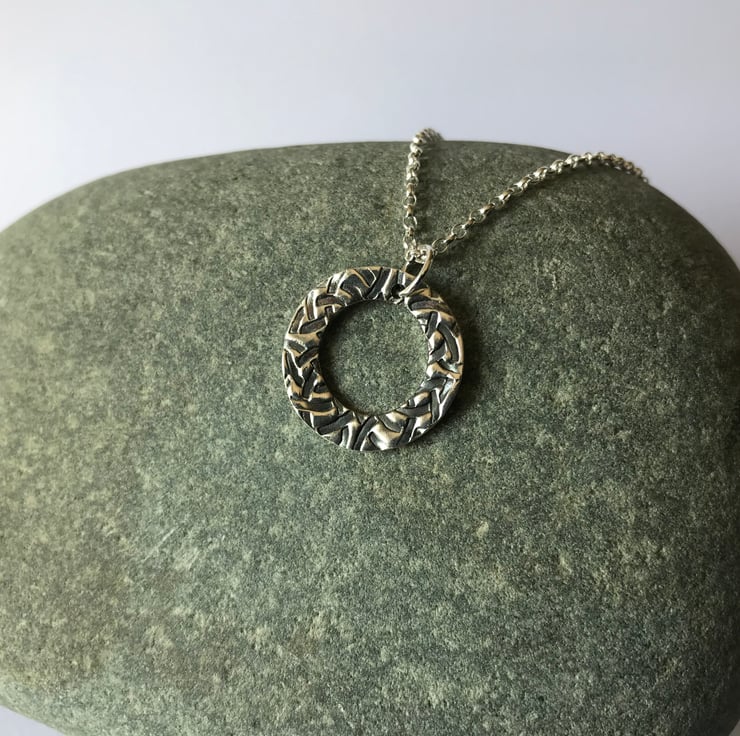 This circular hoop pendant made in fine silver has a Celtic pattern which has been dipped in liver of sulphur to emphasise it’s pattern.
