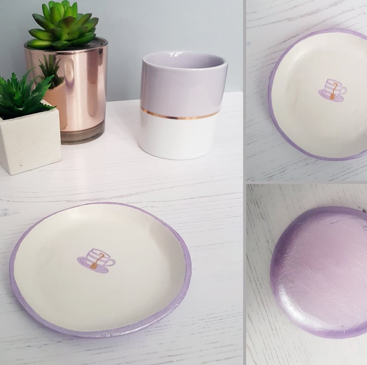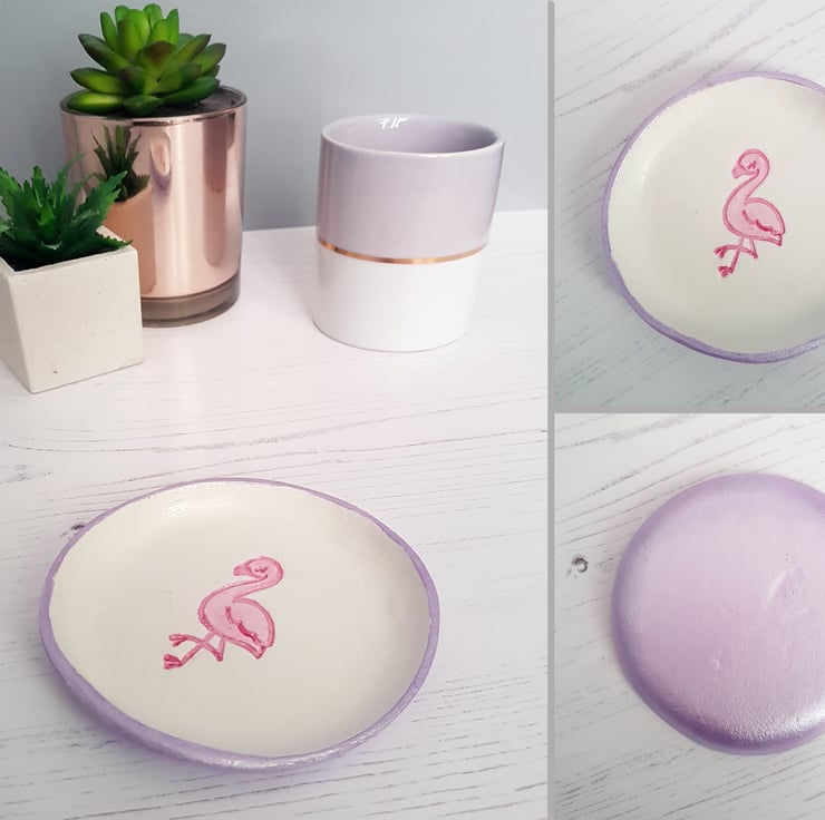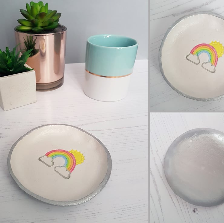 These beautiful ring dishes are all carefully hand made from air dry clay, with a hand stamped icon in the centre of each. Once dried using a dryer machine, they are sanded to make the edges smooth, and to sand out as many little creases as possible. They are then carefully hand painted using metallic acrylic paint, then sealed all over with a gloss varnish to protect.