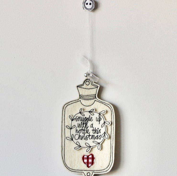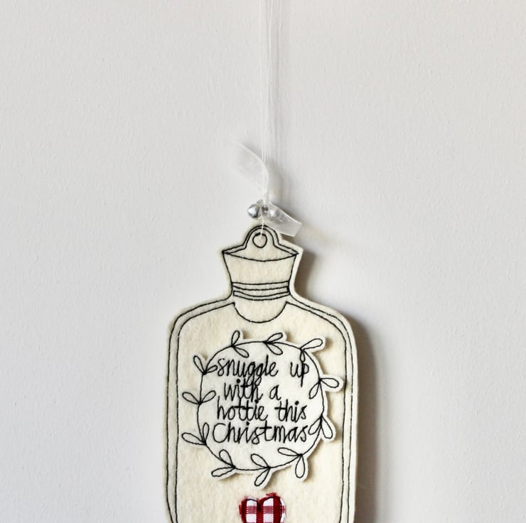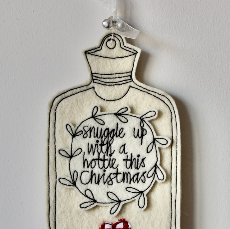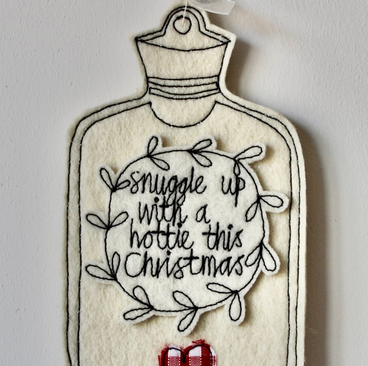 A little hot water bottle displays the words, 'snuggle up with a hottie this Christmas'.