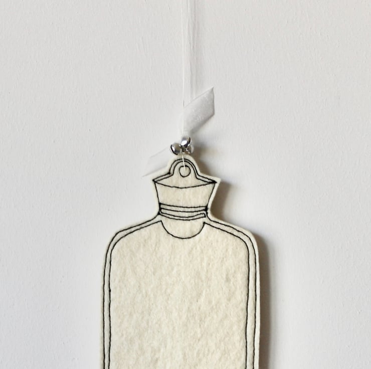 Hottie is created using 100% cream wool felt and free hand machine embroidery. With a red gingham sewn heart, three silver metal bells, organza ribbon and linen thread to hang.