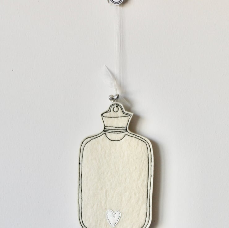 Hottie is created using 100% cream wool felt and free hand machine embroidery. With a iridescent glitter sewn heart, three silver metal bells, organza ribbon and linen thread to hang.