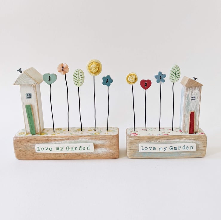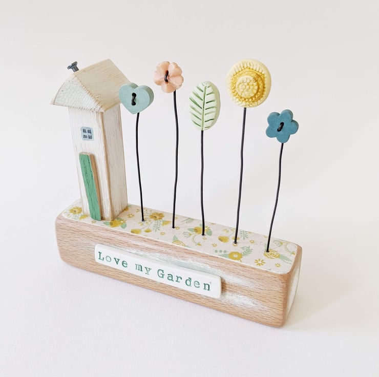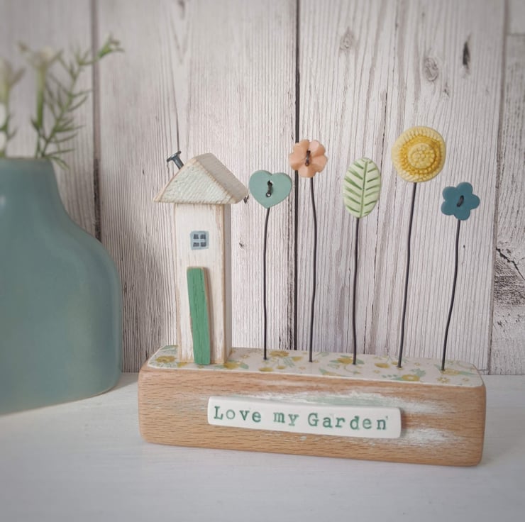 It sits on a painted and decoupaged wood block and on the front there are the hand stamped words 'Love my Garden'.