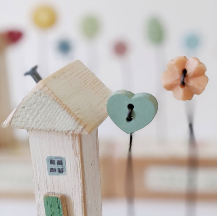 This little hand-painted happy home has a wooden door and a garden of clay and button flowers.
