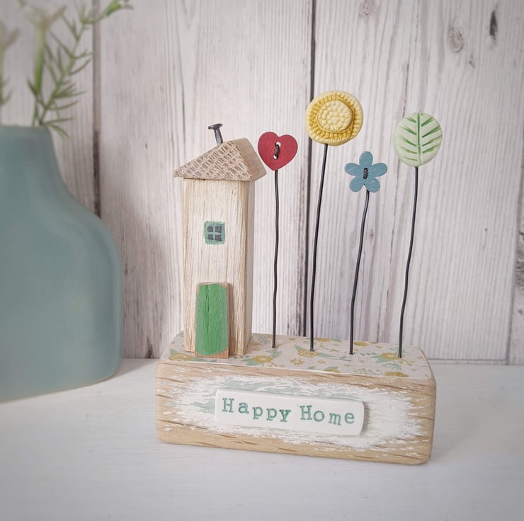 It sits on a painted and decoupaged wood block and on the front there are the hand stamped words 'Happy Home'.