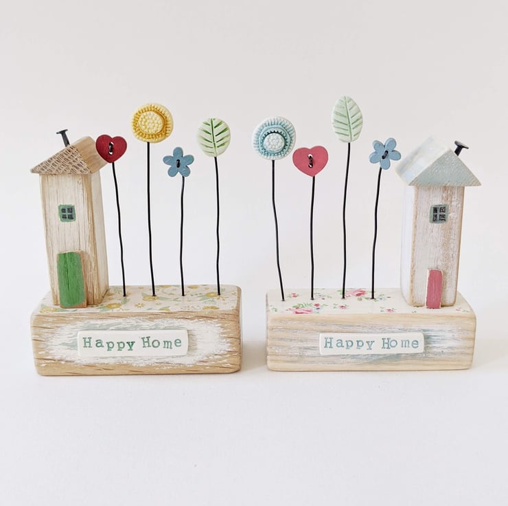 This little hand-painted happy home has a tiny wooden door and a garden of clay and button flowers.