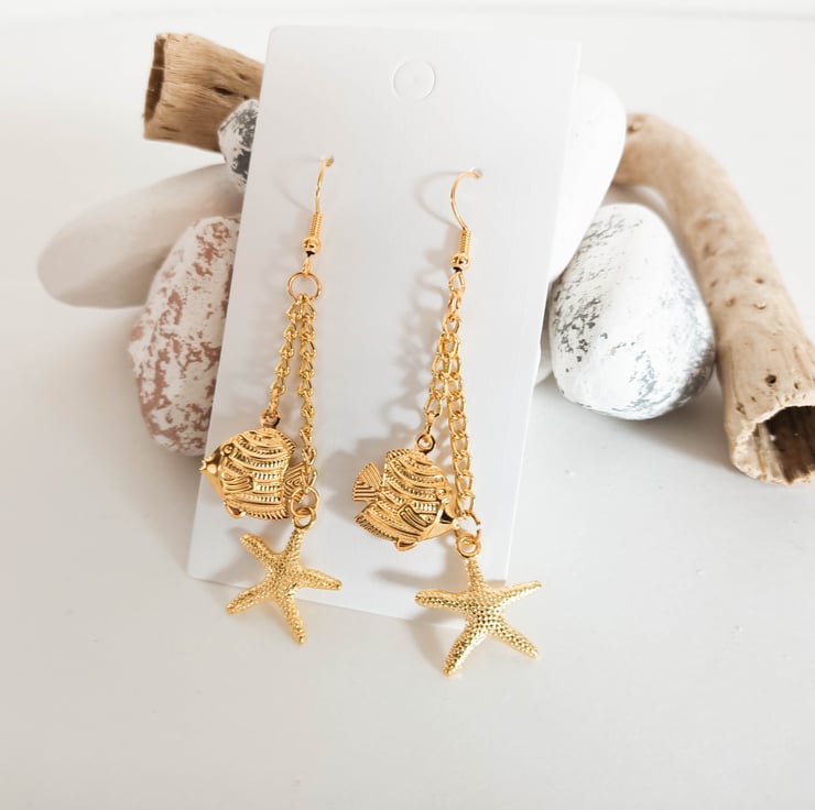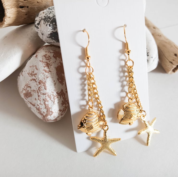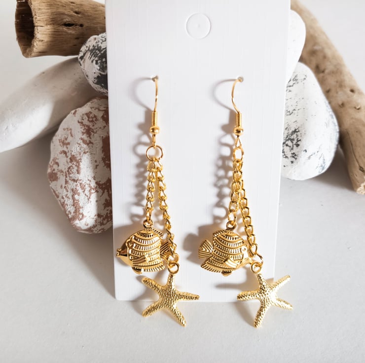 Each gold plated earring fish hook has a gold fish charm and gold starfish charm, both hanging from gold coloured chains.