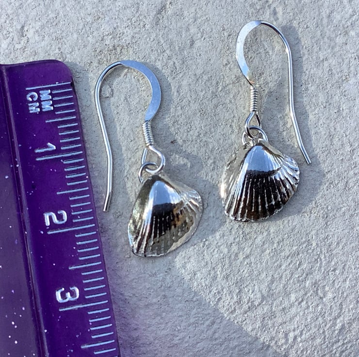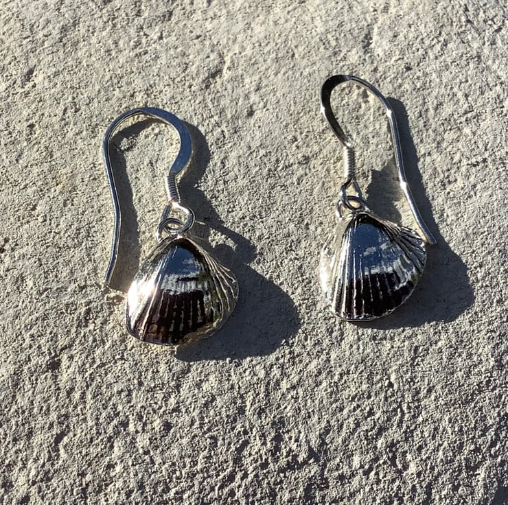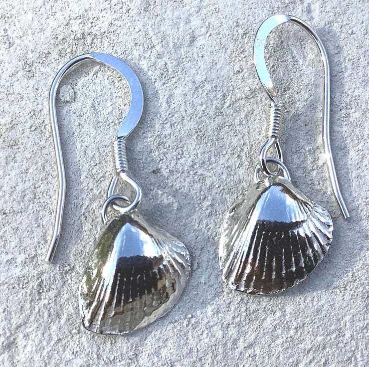 The original shell was found on the beach on the Isle of Wight, I have made a mould from the shell and moulded the silver into it. The silver is then fired in a kiln. When the shell comes out of the kiln, it is white so when these are polished, it gives the shell a unique finish. The earrings are completed with sterling silver findings and ear hooks.