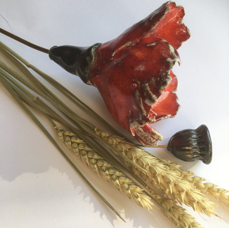 Beautiful Handmade Ceramic Red poppy Flower with hand carved ceramic poppy seed head and small bouquet of natural corn head.