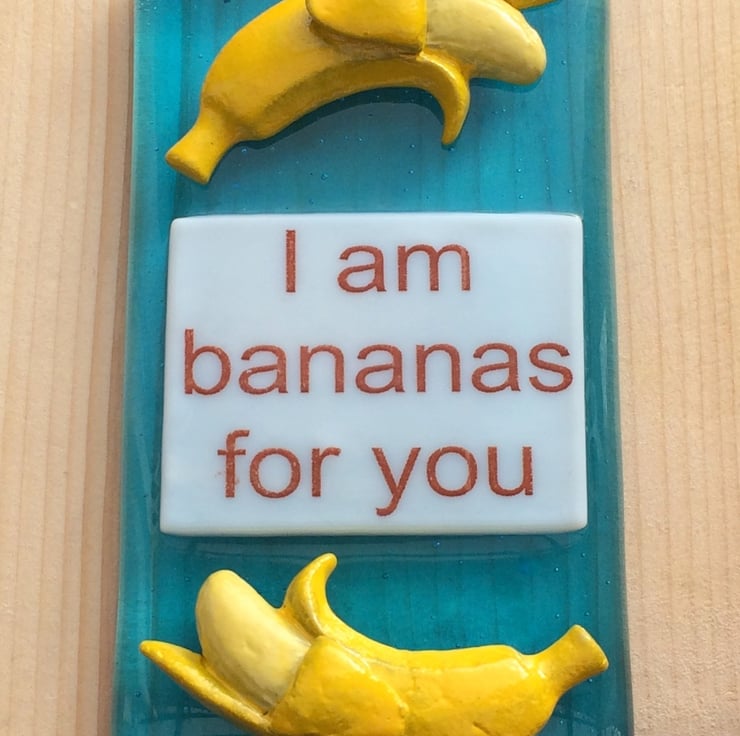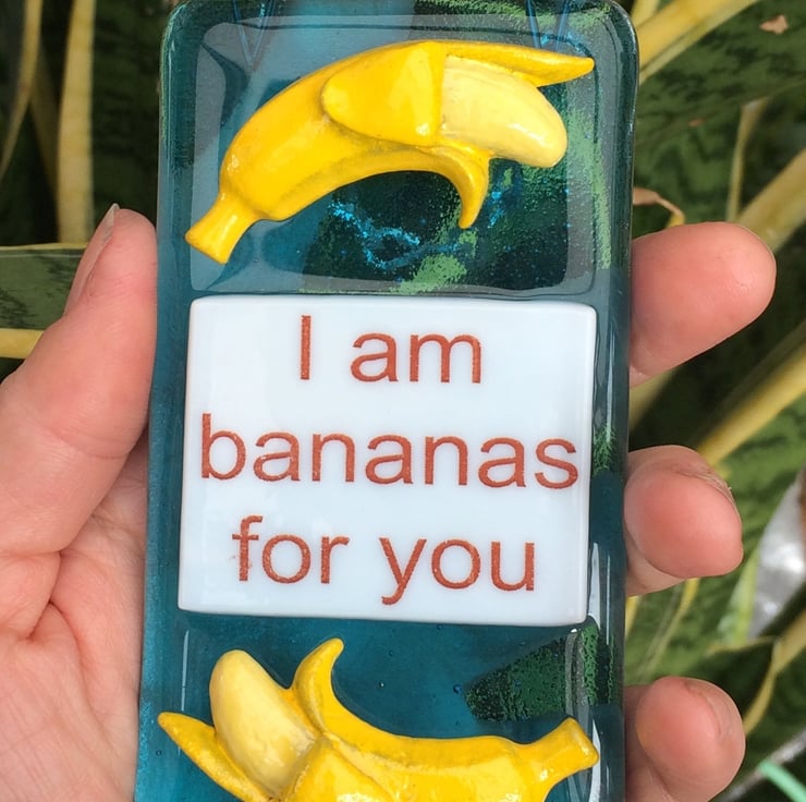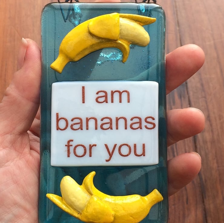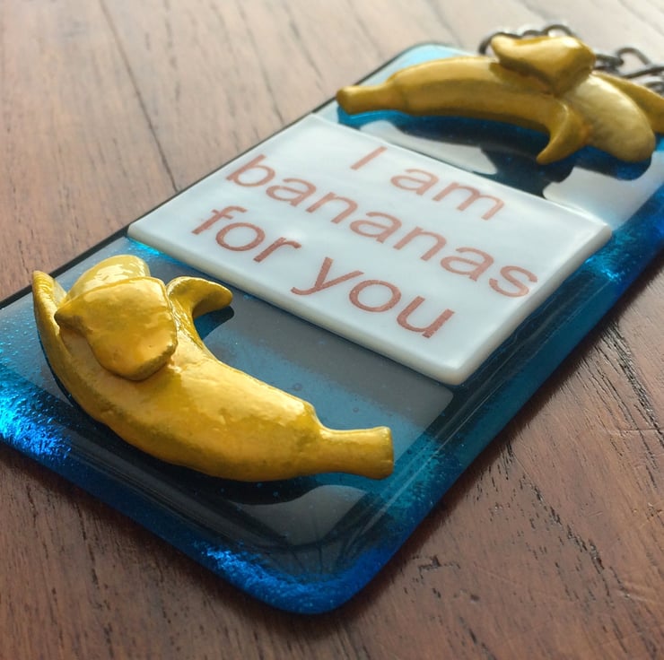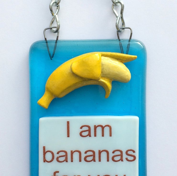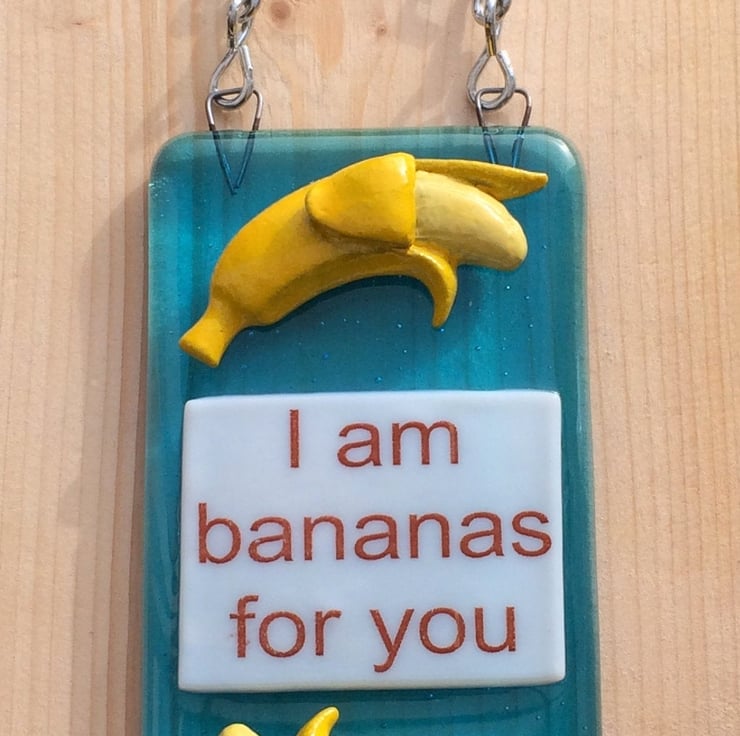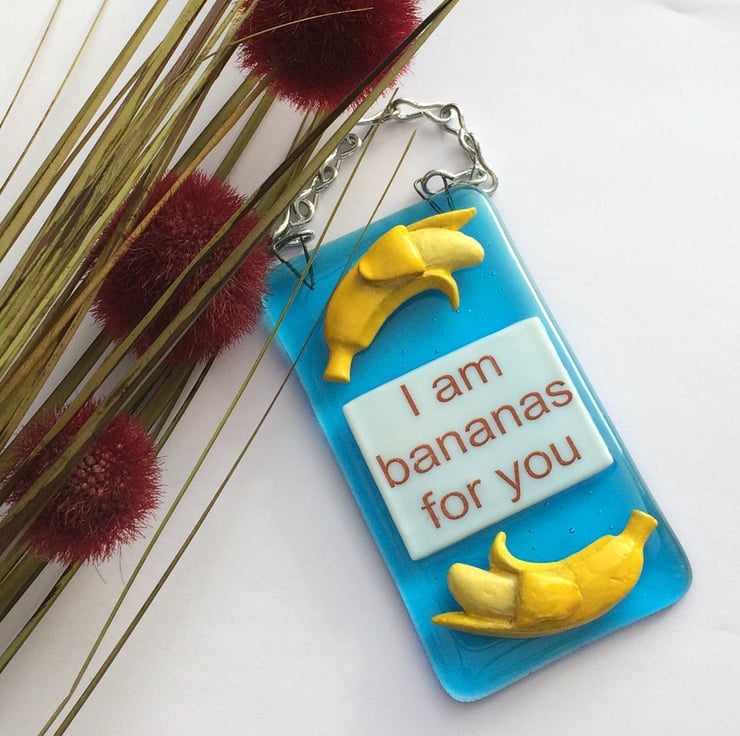 A 'I Am Bananas For You' Suncatcher Hanging Picture Decoration, hung with chain. Handmade from glass that has been fused in a kiln, using only fully tested & compatible best quality art glass. The 3D bananas are made from powdered glass which I turn into a clay. They are then permanently fused onto the glass base in a kiln.