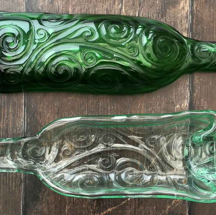 Squashed bottle, made from recycled glass that has been melted and slumped into a serving dish. A perfect upcycling, zero waste eco gift reclaimed bottles transformed into environmentally friendly tableware.