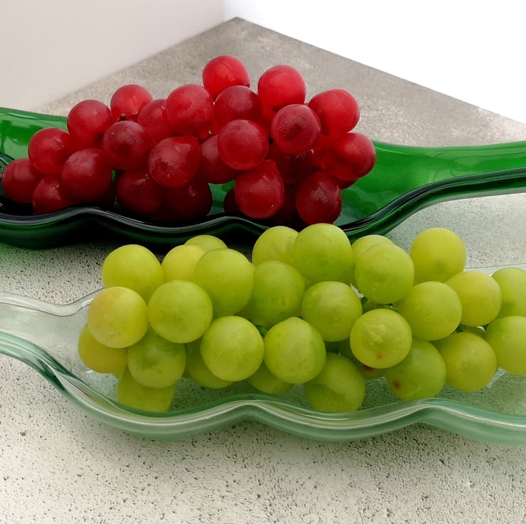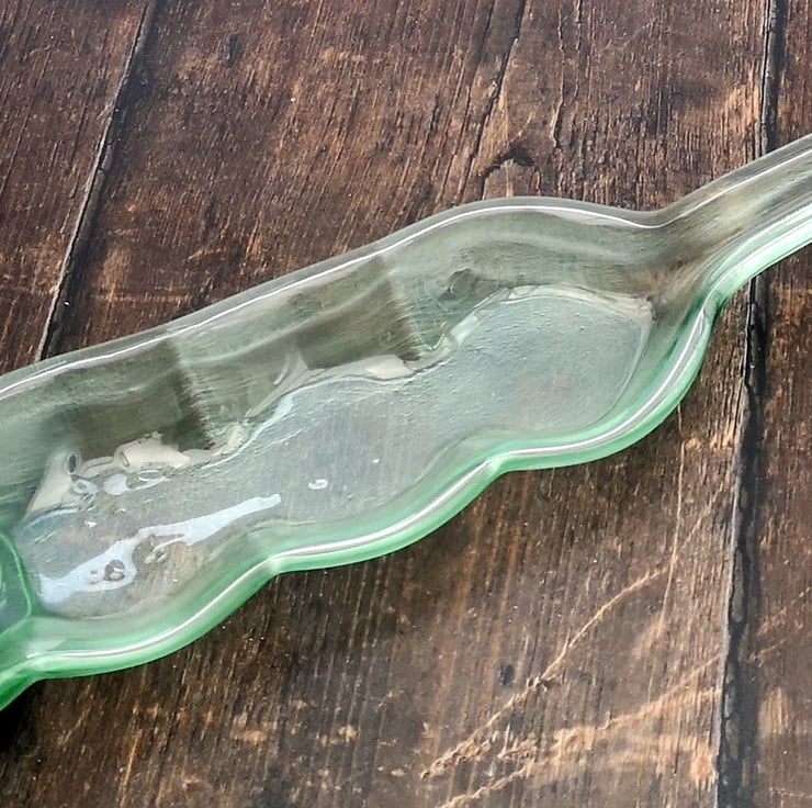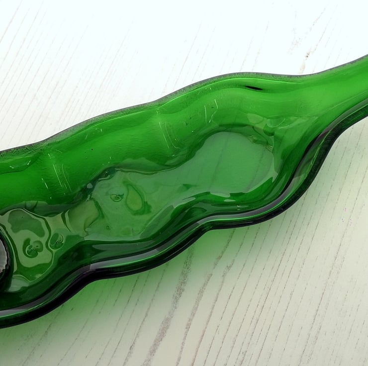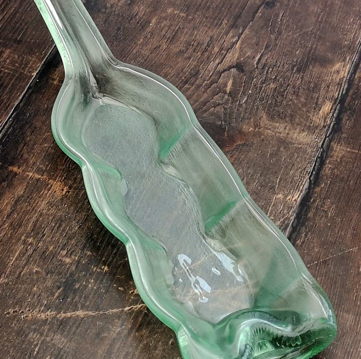Squashed bottle, made from recycled glass that has been melted and slumped into a serving dish. A perfect upcycling, zero waste eco gift reclaimed bottles transformed into environmentally friendly tableware.