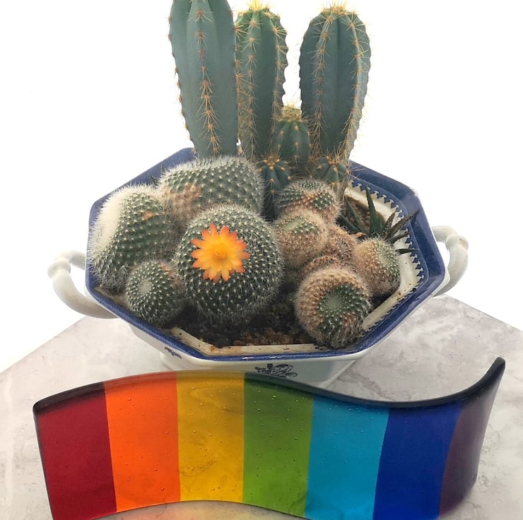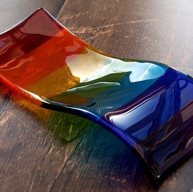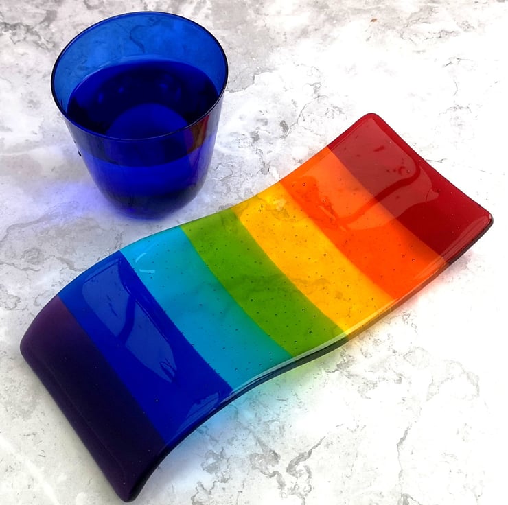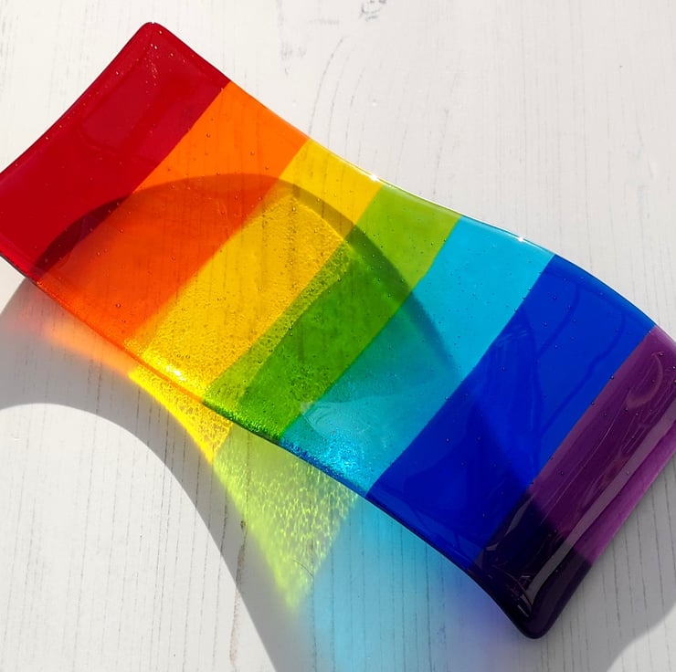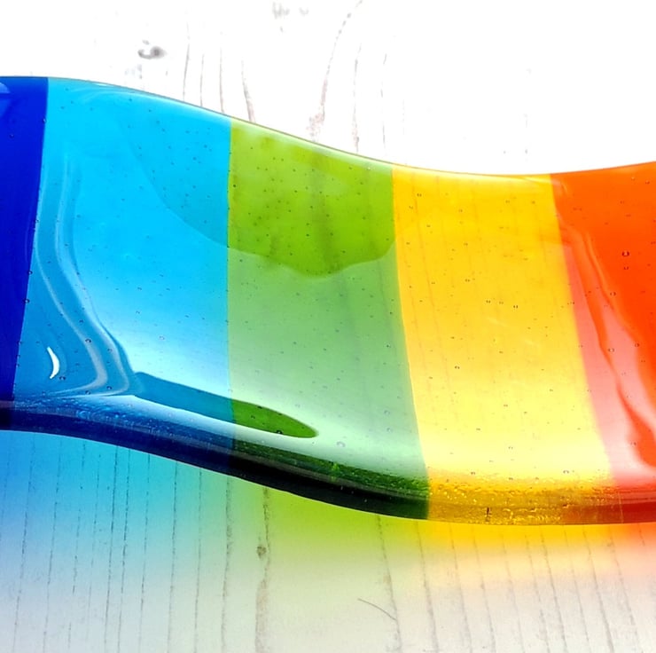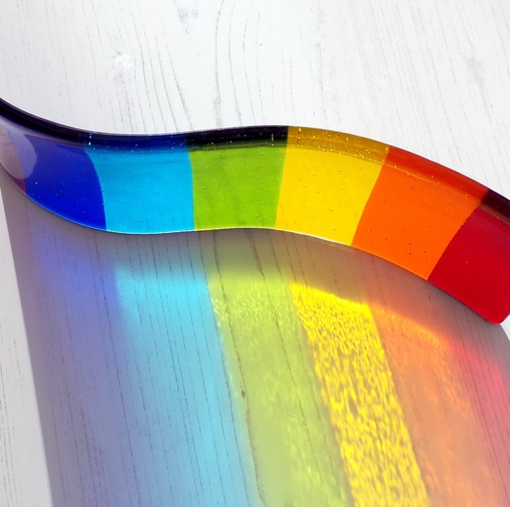 A Free Standing Rainbow Curved Picture Suncatcher. Or spoon rest if lying flat. Handmade from glass that has been fused in a kiln, using only fully tested & compatible best quality art glass.