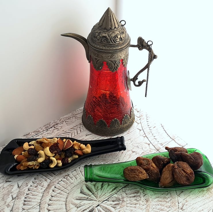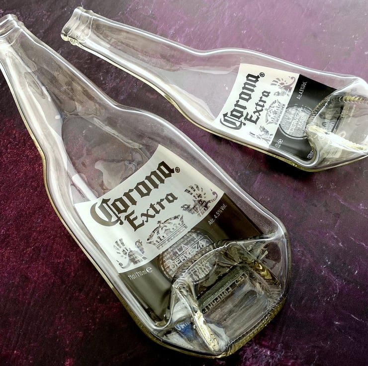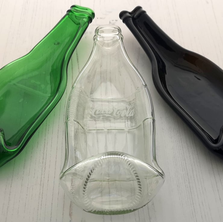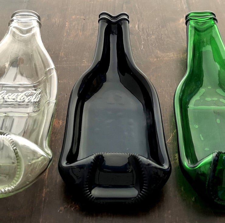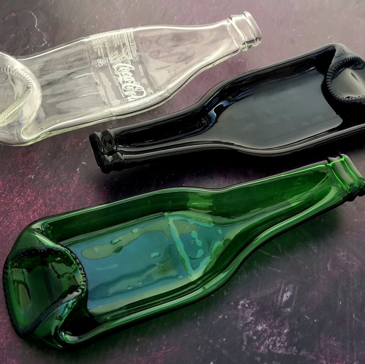 Squashed bottle, made from recycled glass that has been melted and slumped into a serving dish. A perfect upcycling, zero waste eco gift reclaimed bottles transformed into environmentally friendly tableware.