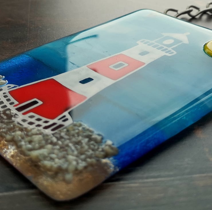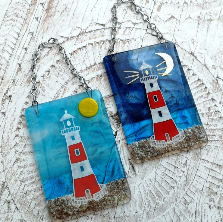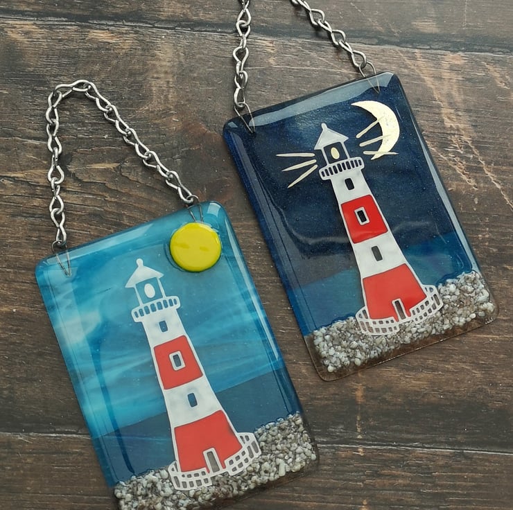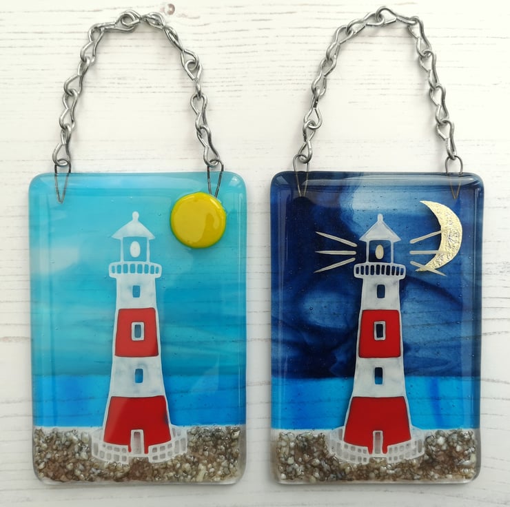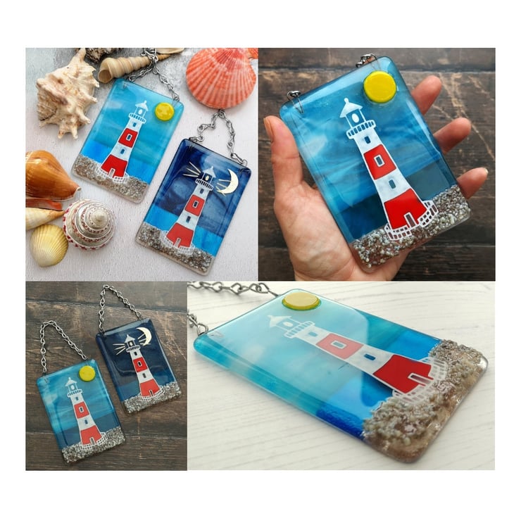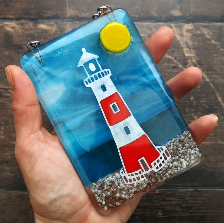 A Lighthouse Hanging Picture, Suncatcher. Handmade from glass that has been fused in a kiln, using only fully tested & compatible best quality art glass. The picture is hung on a chain which has been permanently fused into the glass.