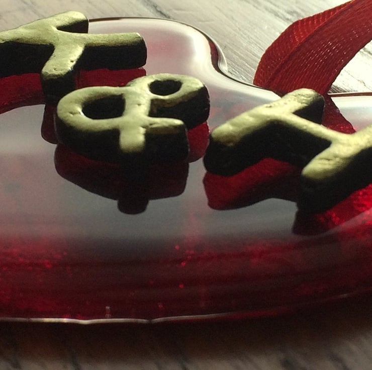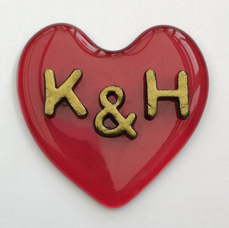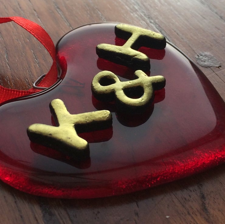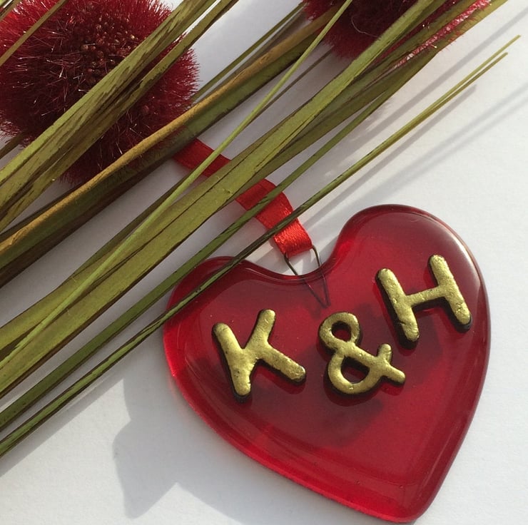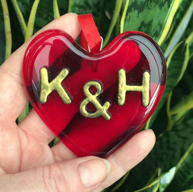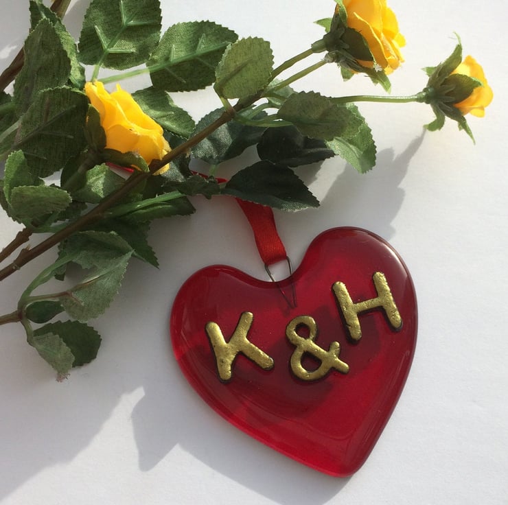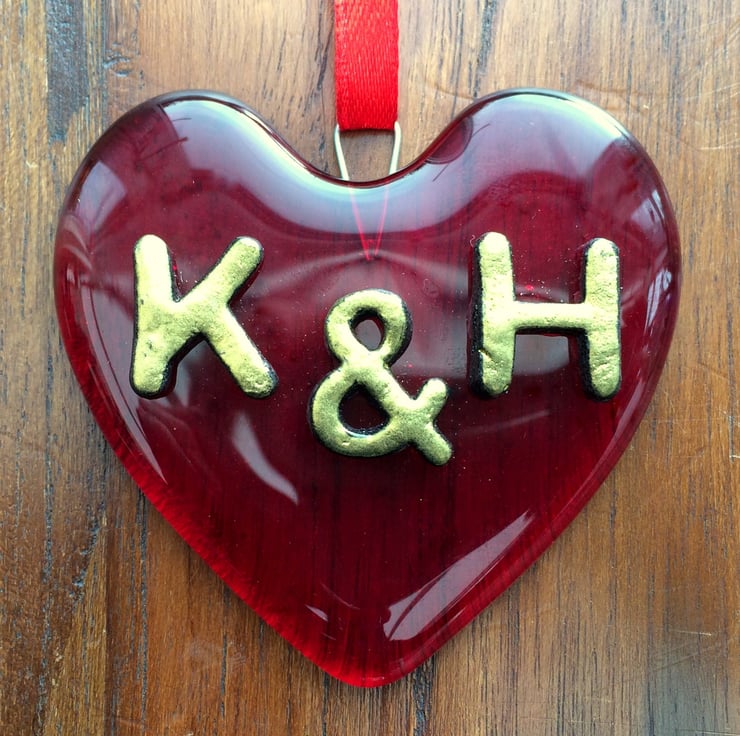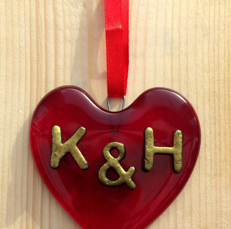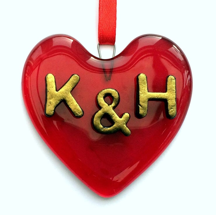 A Red Love Heart Hanging Decoration with 3D personalised initials. Hung with red satin ribbon. Handmade from glass that has been fused in a kiln, using only fully tested & compatible best quality art glass. The 3D lettering is also made from glass and is permanently fused onto the red heart base.