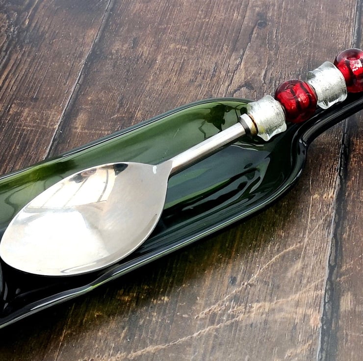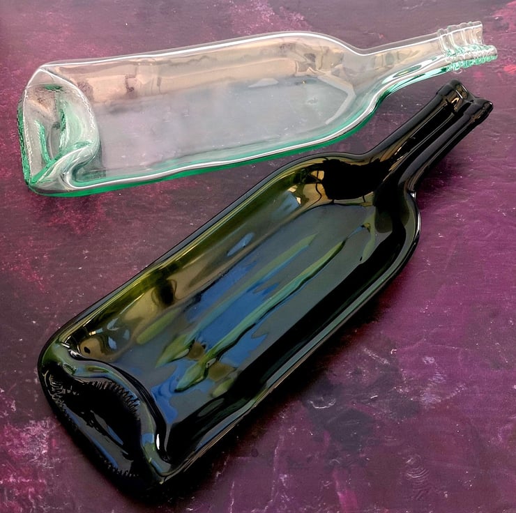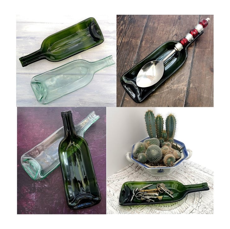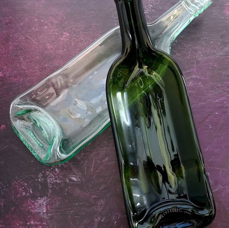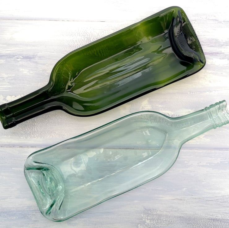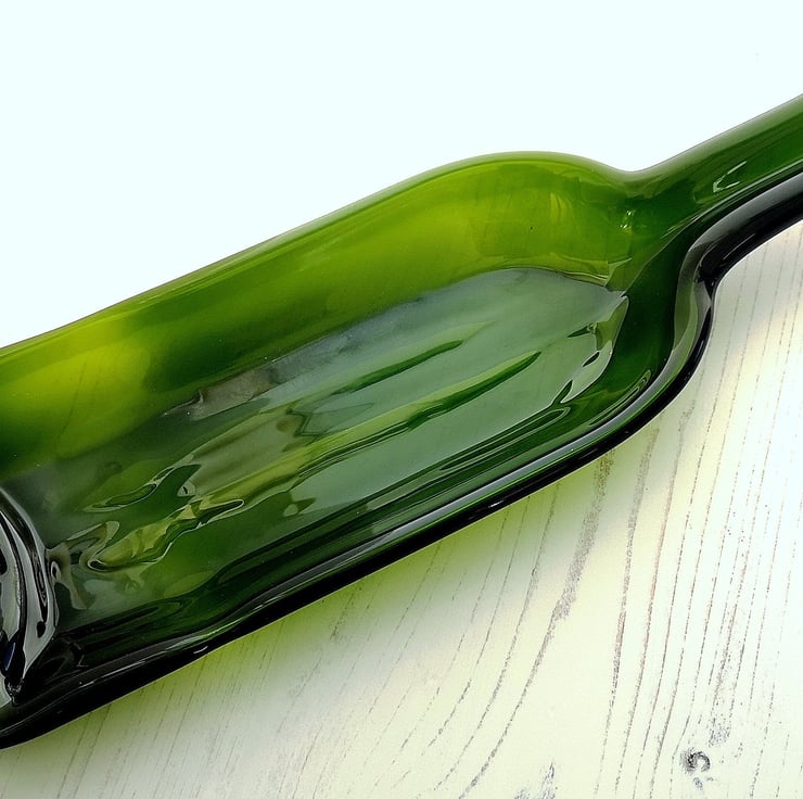 Squashed bottle, made from recycled glass that has been melted and slumped into a serving dish. A perfect upcycling, zero waste eco gift reclaimed bottles transformed into environmentally friendly tableware.