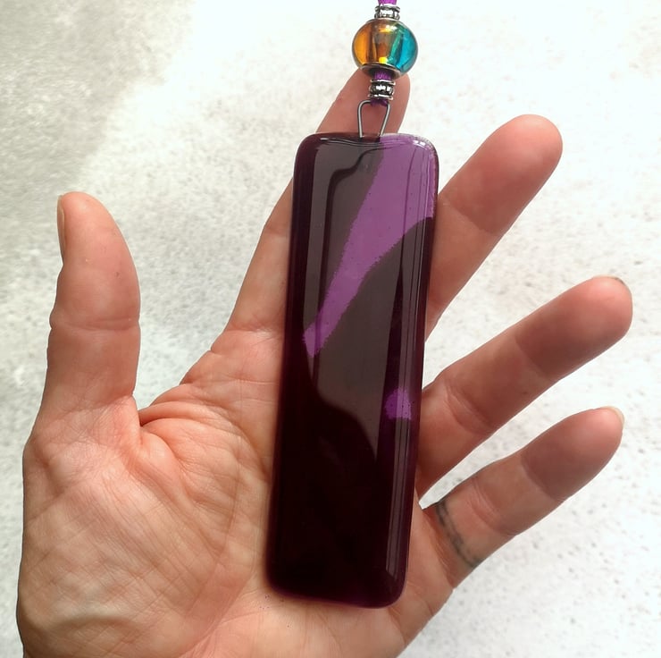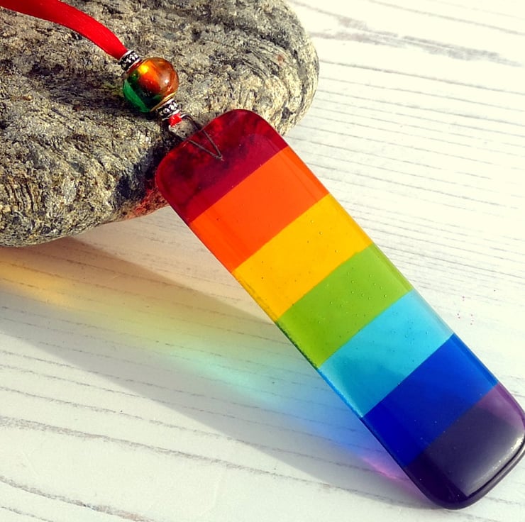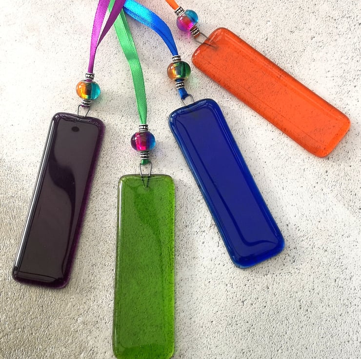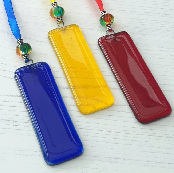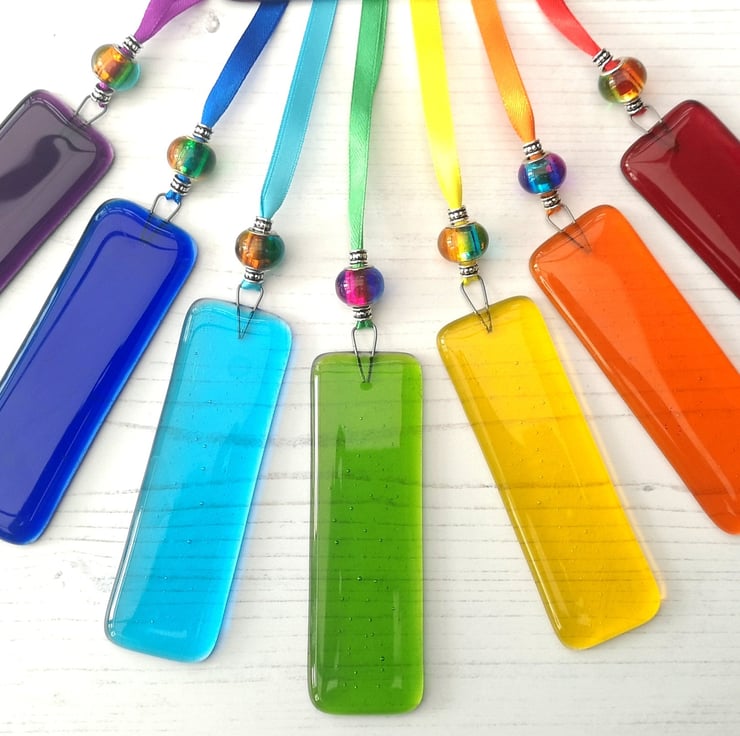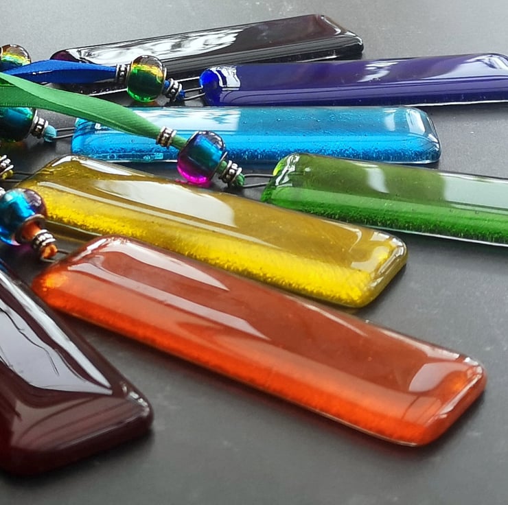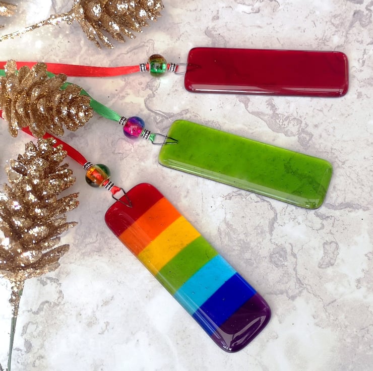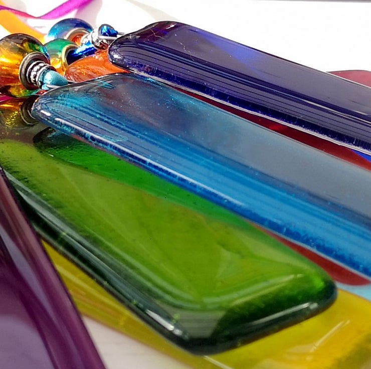 Rectangular Rainbow Coloured Fused Glass Hanging Decorations.