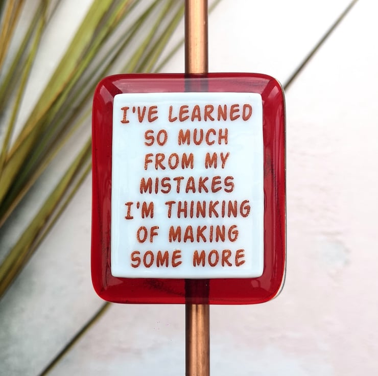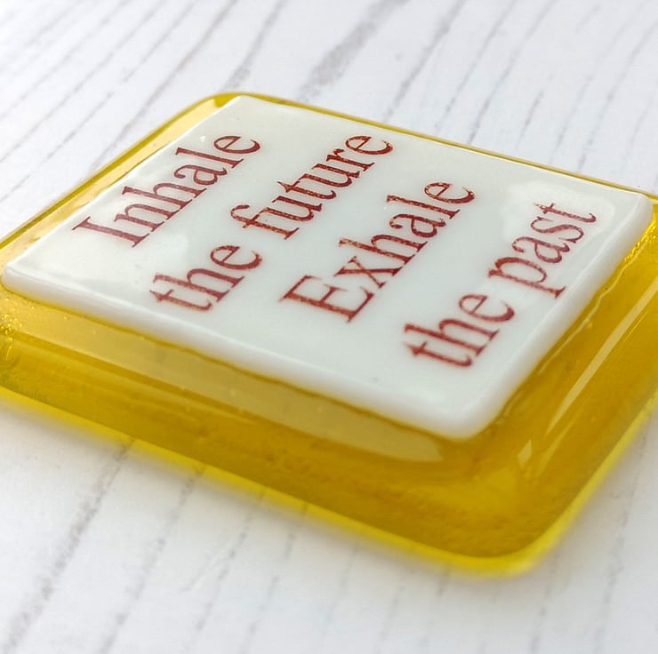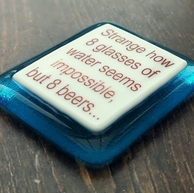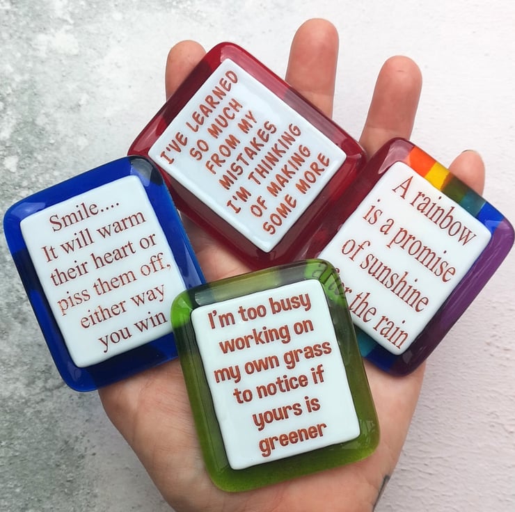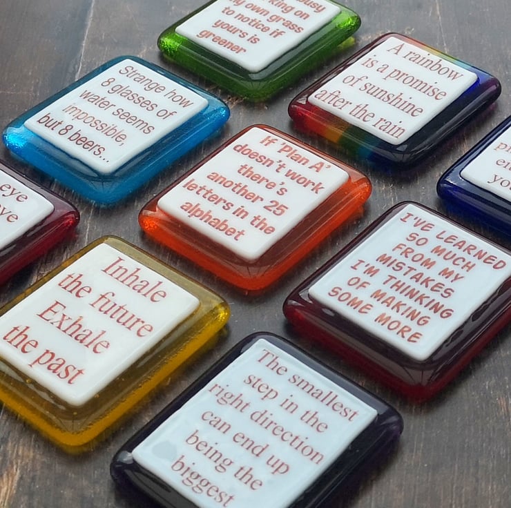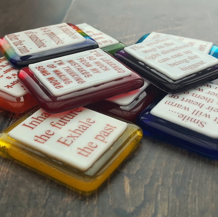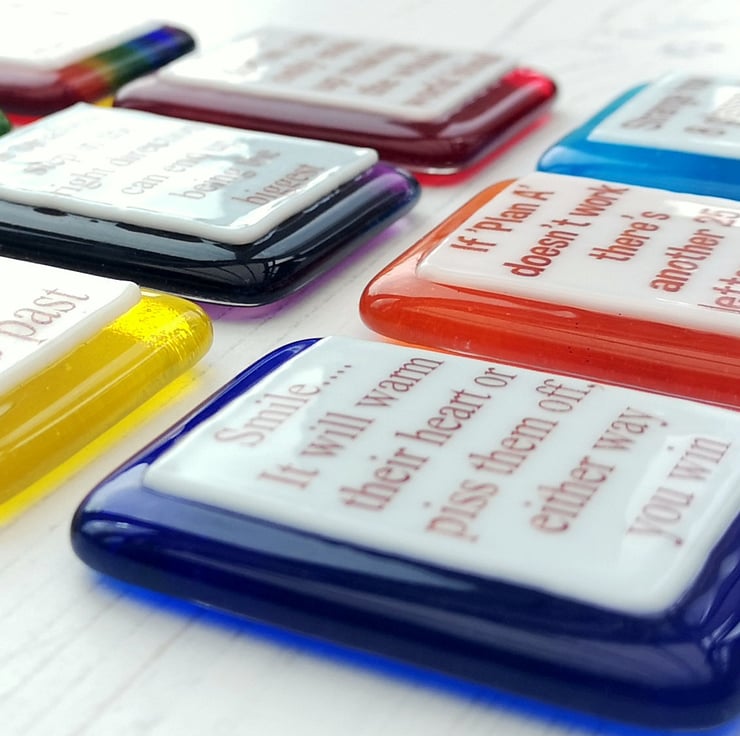 Phrase Fridge Magnet. Handmade from glass that has been fused in a kiln, using only fully tested best quality art glass. A strong neodymium magnet is glued onto the back using very strong glass glue, to keep your magnet safely in place.