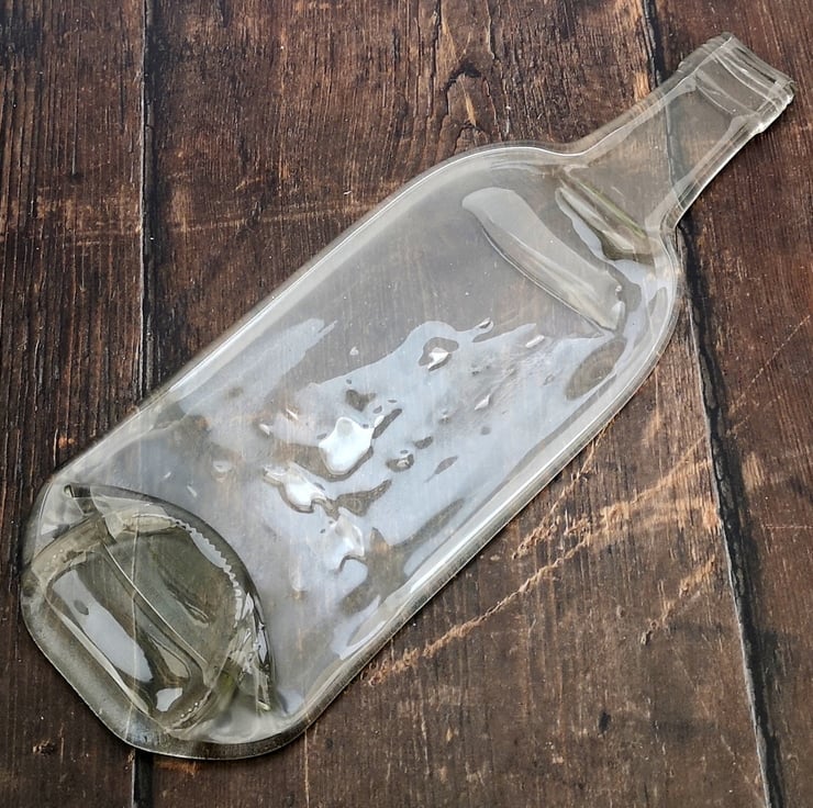 Squashed bottle, made from recycled glass that has been melted to make a flat serving plate. A perfect upcycling, zero waste eco gift reclaimed bottles transformed into environmentally friendly tableware.