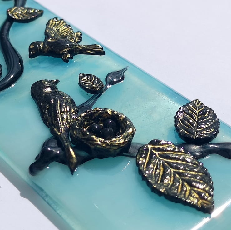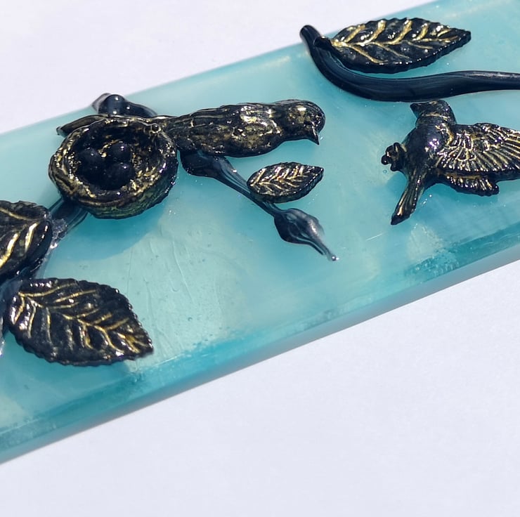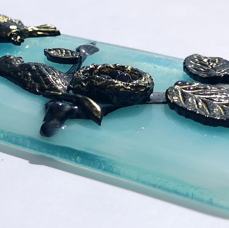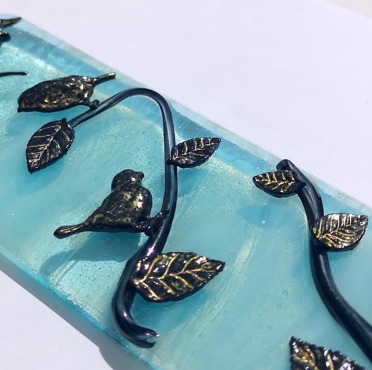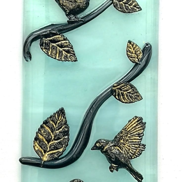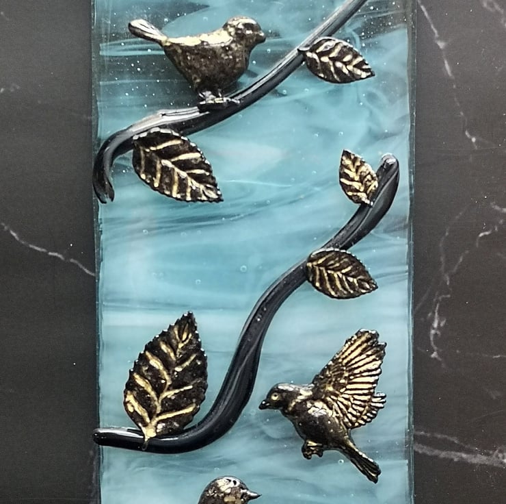 Made To Order - The pictures are an example of what the ones you receive will look like, slight variations are to be expected. Each picture is individual. The pattern on the light blue 'sky coloured' background glass can vary, and how I lay out the birds and leaves depends on how the glass I use for the branches is added. If you would like me to send you a photo of the finished piece before posting please send me a message.