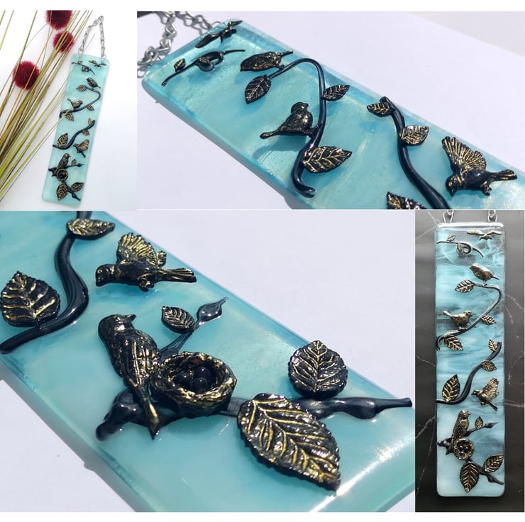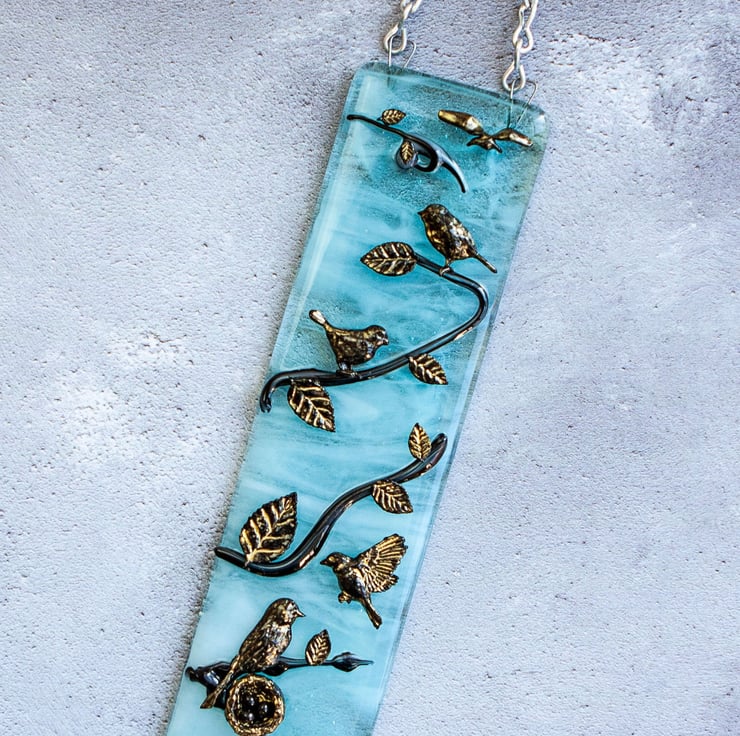 A 3D Birds In A Tree Suncatcher Hanging Picture, hung with chain. Handmade from glass that has been fused in a kiln, using only fully tested & compatible best quality art glass. The 3D birds & leaves etc made from powdered glass which I turn into a clay. They are then permanently fused onto the glass base in a kiln.